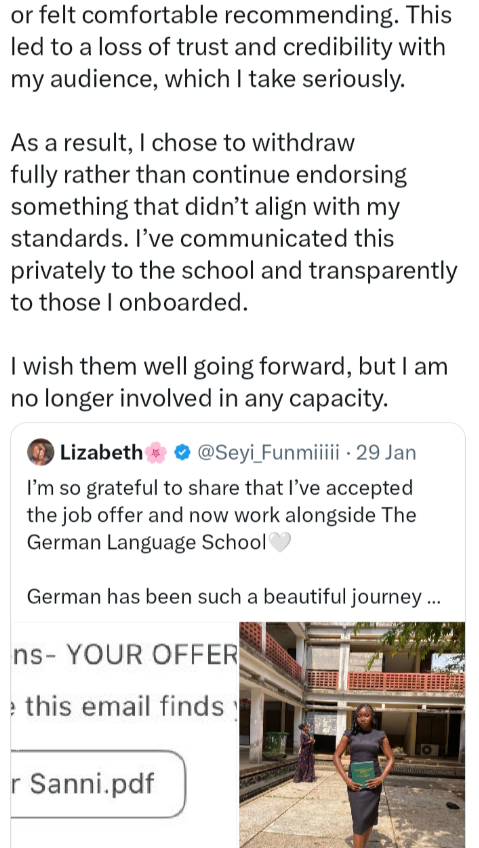Oluwaseyifunmi added that she had informed the school privately and communicated transparently with participants. She emphasized that she is no longer connected to the institution in any capacity but wished them well going forward.