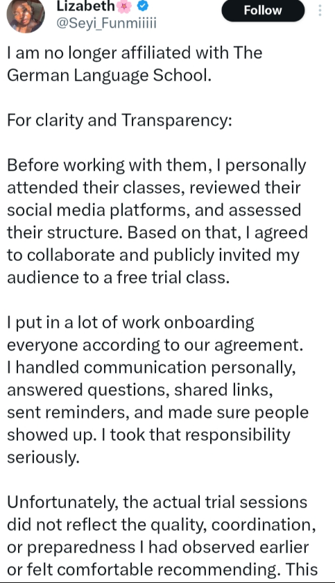 “I am no longer affiliated with The German Language School. Before working with them, I personally attended their classes, reviewed their social media platforms, and assessed their structure. Based on that, I agreed to collaborate and publicly invited my audience to a free trial class,” she said.