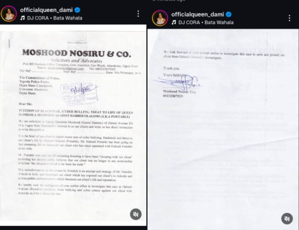 In other news… Queen Dami, the former wife of the late Alaafin of Oyo, has filed a petition against her ex-boyfriend, singer Portable, accusing him of cyberbullying, blackmail, and related offences.