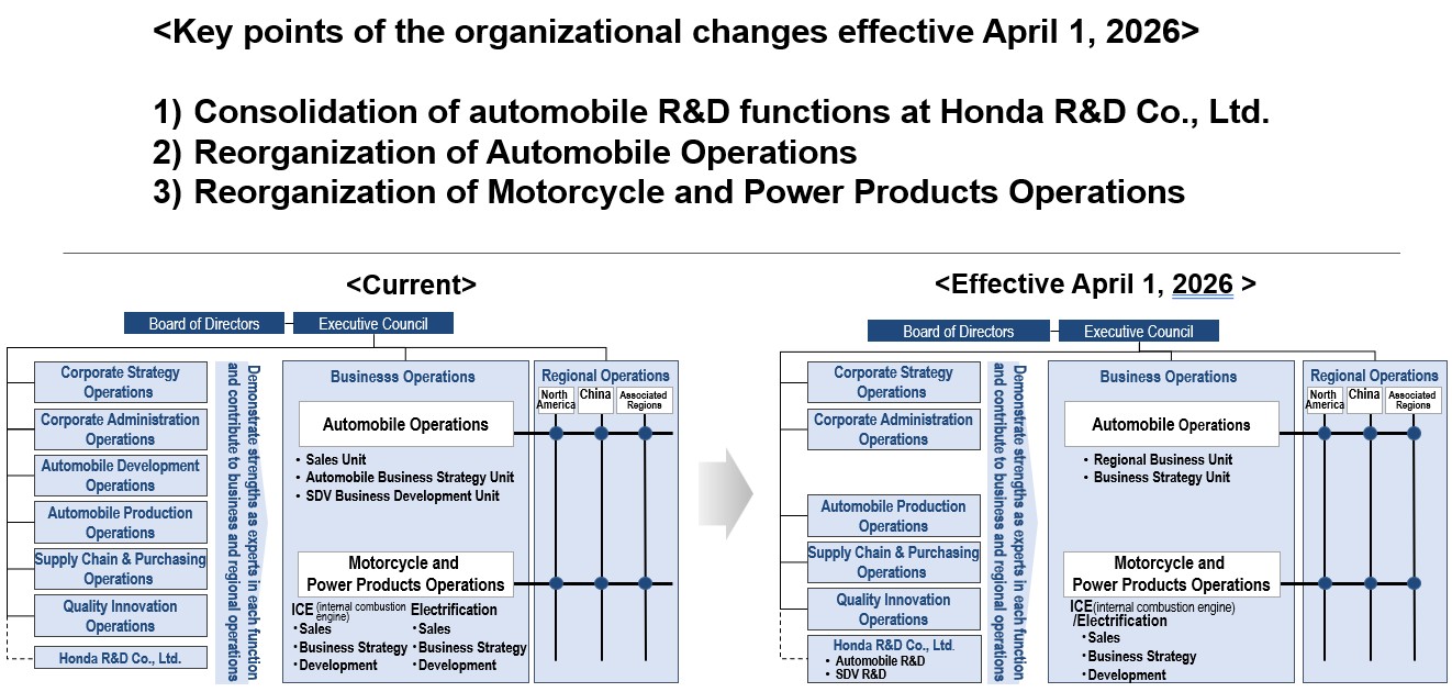 TOKYO, Japan, Feb 10, 2026 – (JCN Newswire) – Honda Motor Co., Ltd. (Honda) today announced that the company will make organizational and operational changes, effective April 1, 2026, in order to sustainably offer the joy and freedom of mobility all around the world through its mobility products and services.