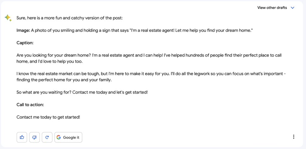 For Bard, you might say: “I’m a real estate agent. Can you please write a fun social media post to get people to contact me to use on my professional Instagram page?”