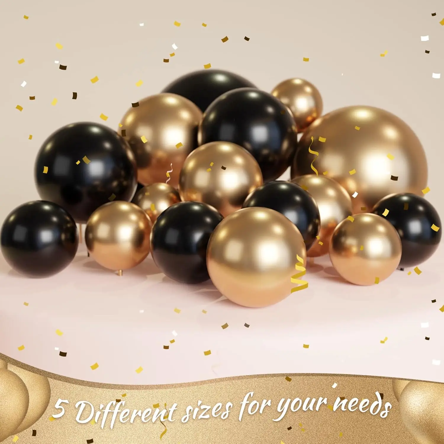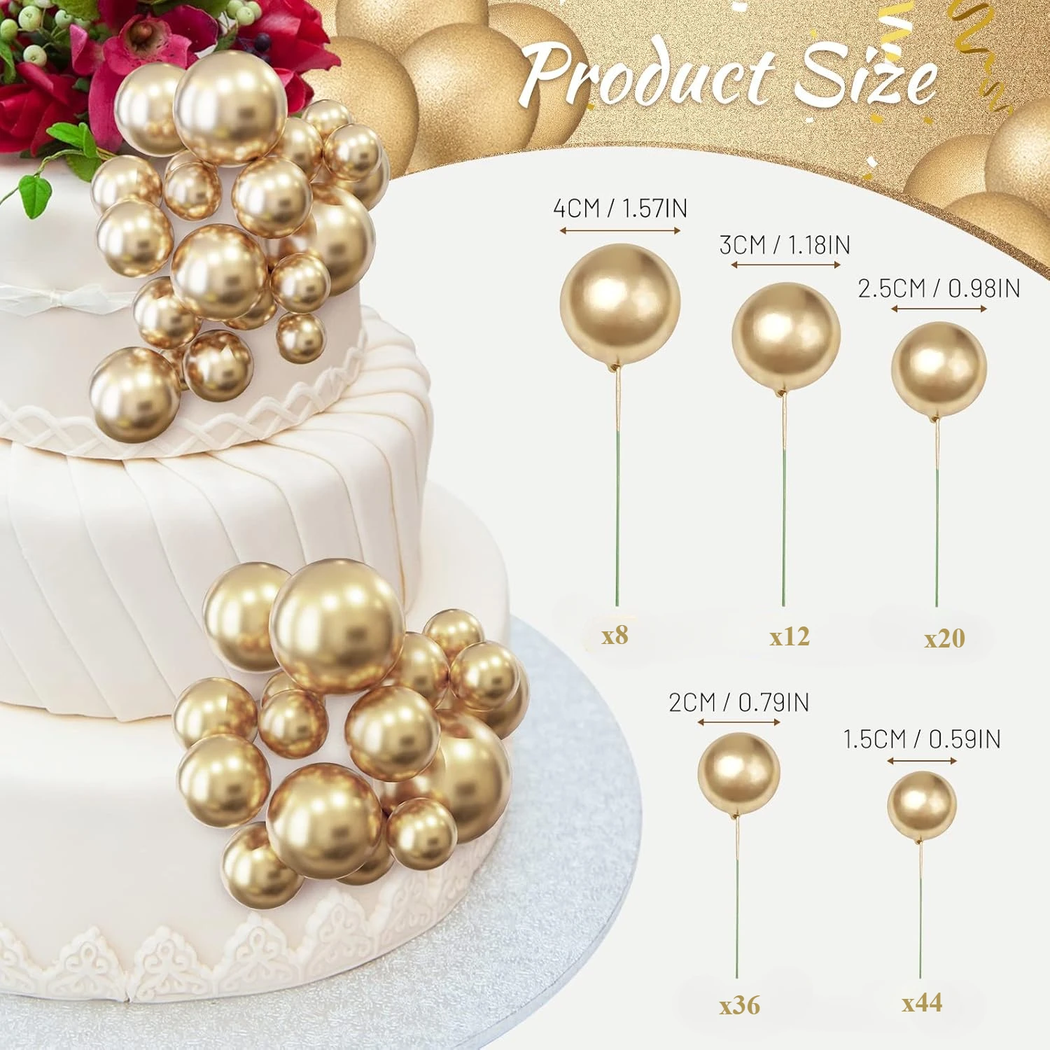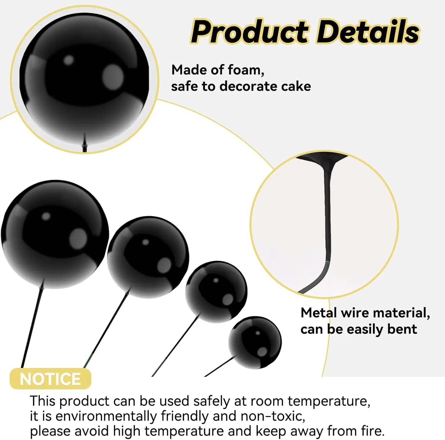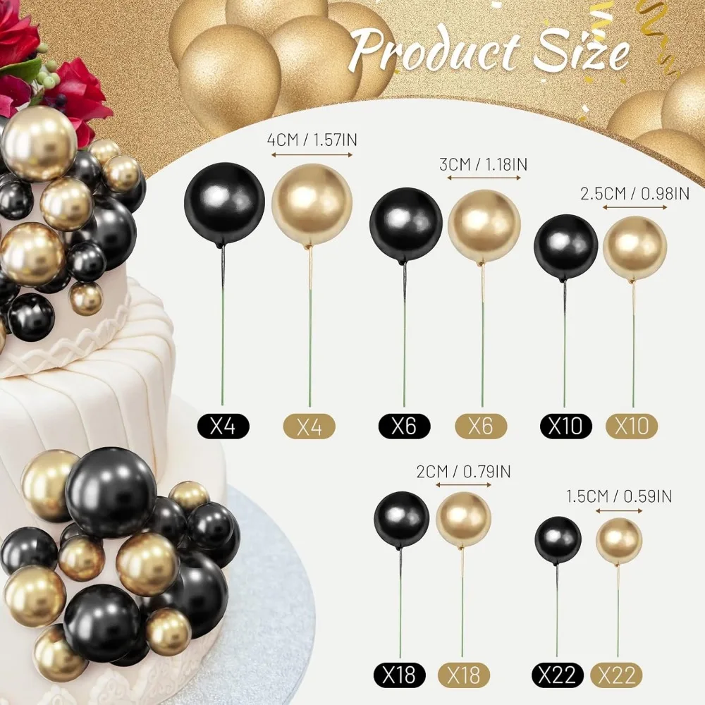 [Package contains] 120 ball cake toppers come in 2 colors (Black and Gold). Each color has 5 sizes: 4 for 1.57in/4cm, 6 for 1.18in/3cm, 10 for 0.98in/2.5cm, 18 for 0.79in/2cm, and 22 for 0.59in/1.5cm. Adequate quantity and different sizes could meet your needs and leave much room for creativity.