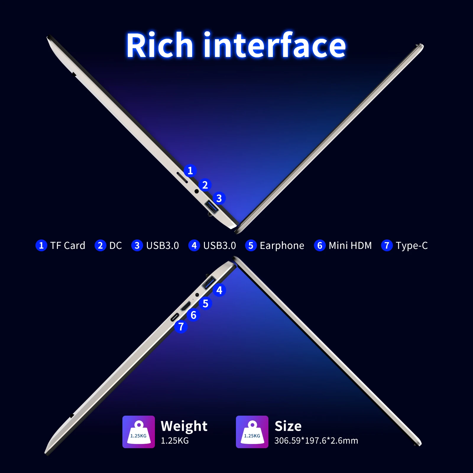 equipped with Mini HDMI x1, USB 3.0 x2, TF card port x1 ,Type C*1 (only for data). Many multifunctional ports on KUU laptops basically meet the requirements of life and work.