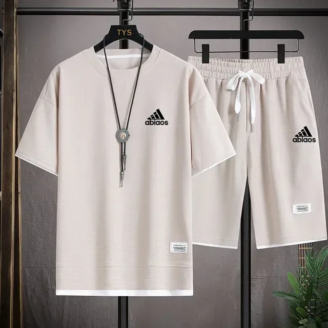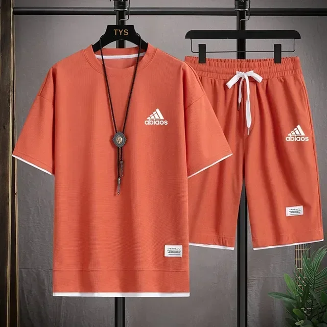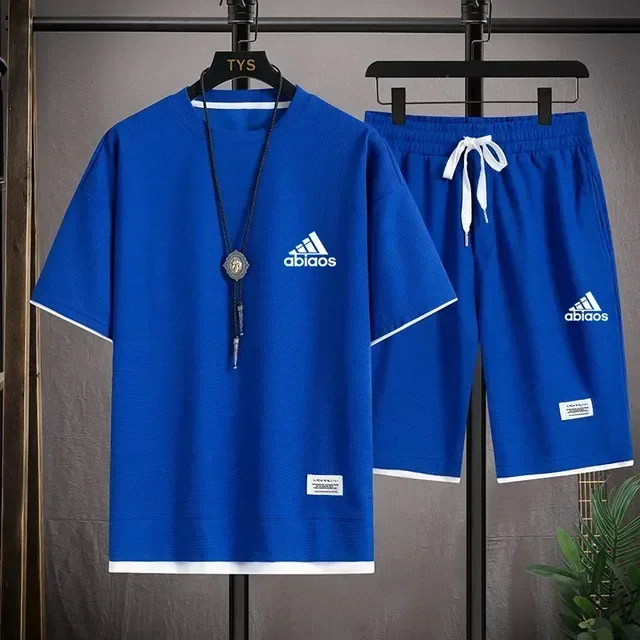 2024 Fashion Summer Men Breathable and Comfortable Waffle Short Sleeve Casual T-shirt + Athletic Shorts 2-piece jogging suit