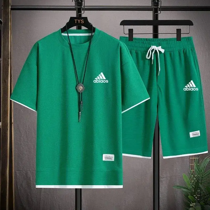 2024 Fashion Summer Men Breathable and Comfortable Waffle Short Sleeve Casual T-shirt + Athletic Shorts 2-piece jogging suit