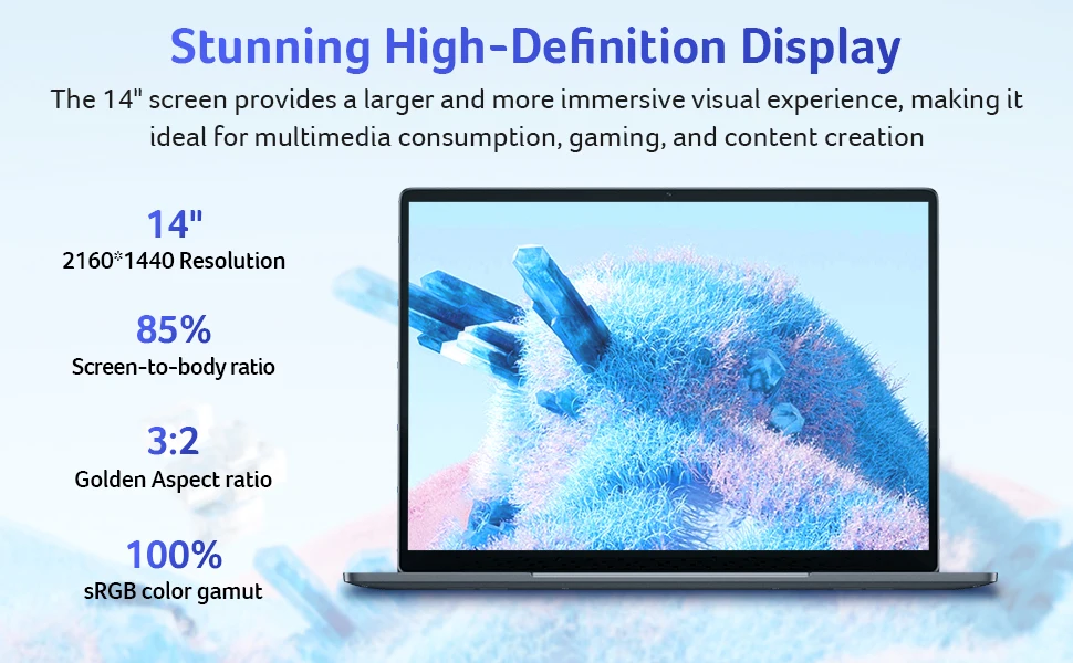 Display Type: 3:2, IPS Screen Size: 14-inch, 301.51*208.61*2.6MM Resolution: 2160×1440 NTSC: 70% |