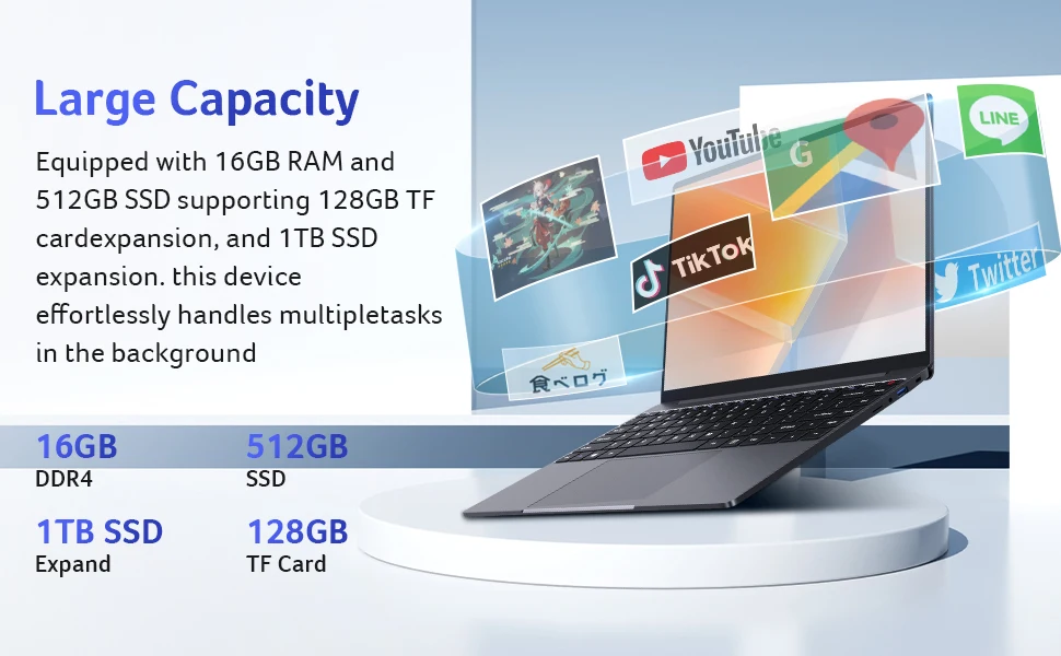 RAM: DDR4 SODIMM 16GB ROM: 512GB SSD Extended Storage: SSD MAX 1TB About Storage: The actual available internal storage may differ depending on the software configuration of your laptops. |