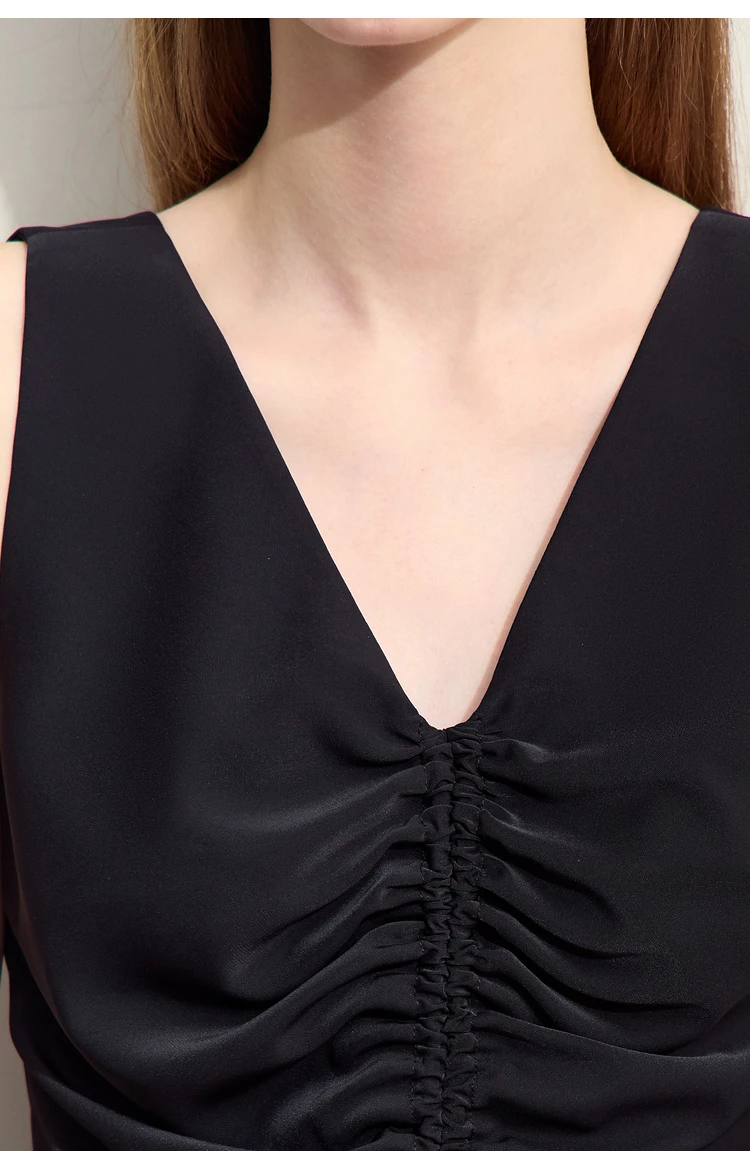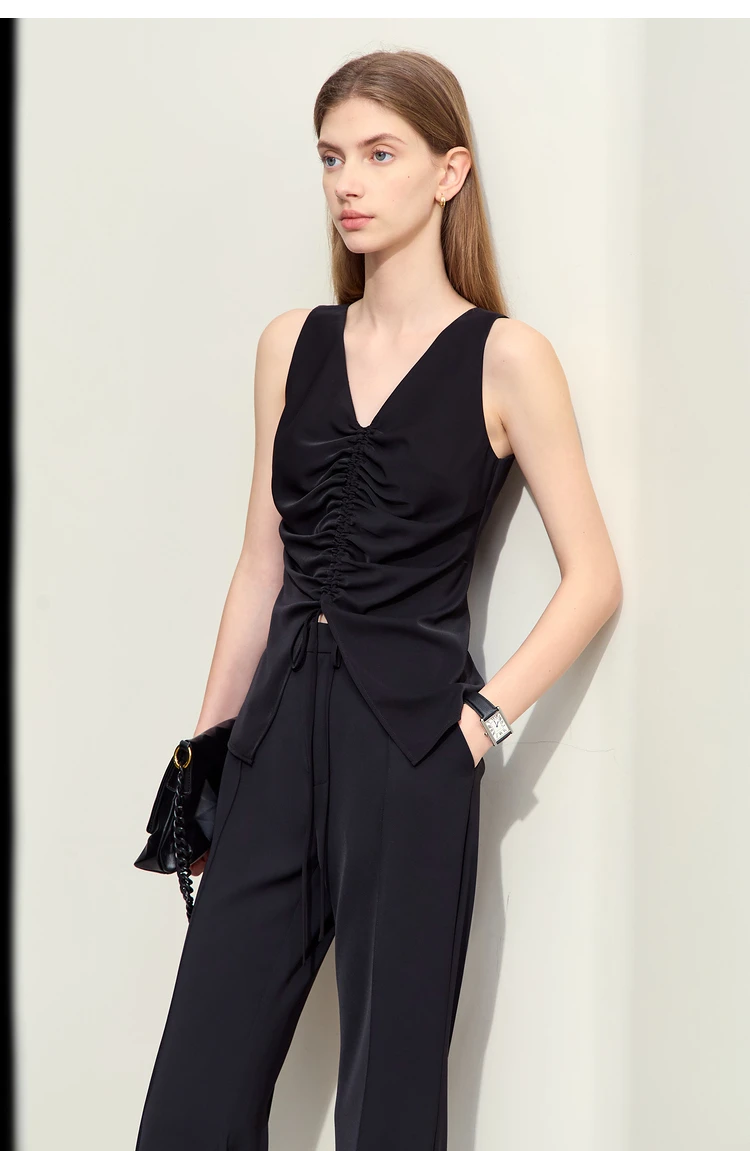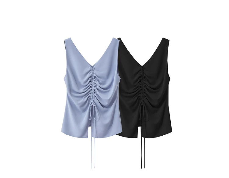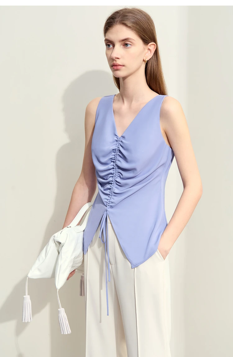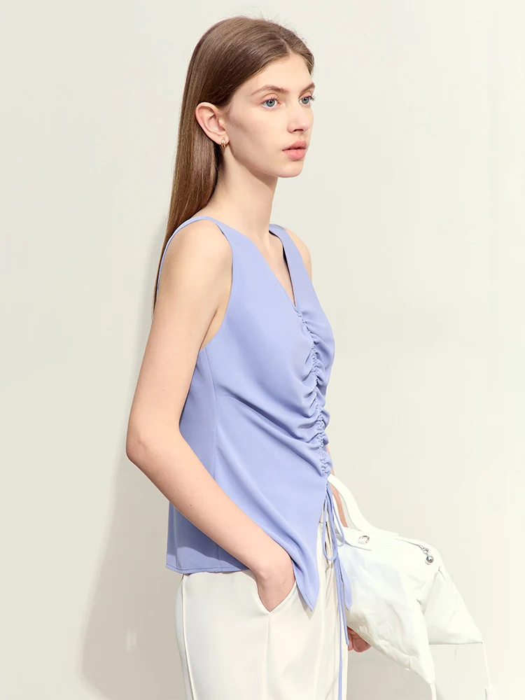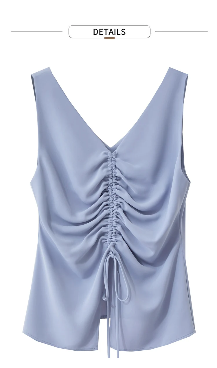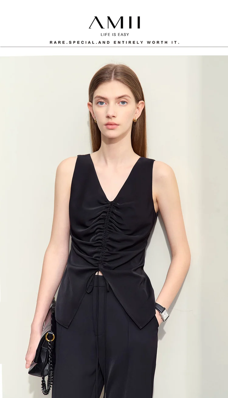Amii Minimalism 2024 Women Tanks & Camis Summer New Commuter V-neck Draw-pleated Strap Slim Slit Chiffion Basics Tops 12442215
