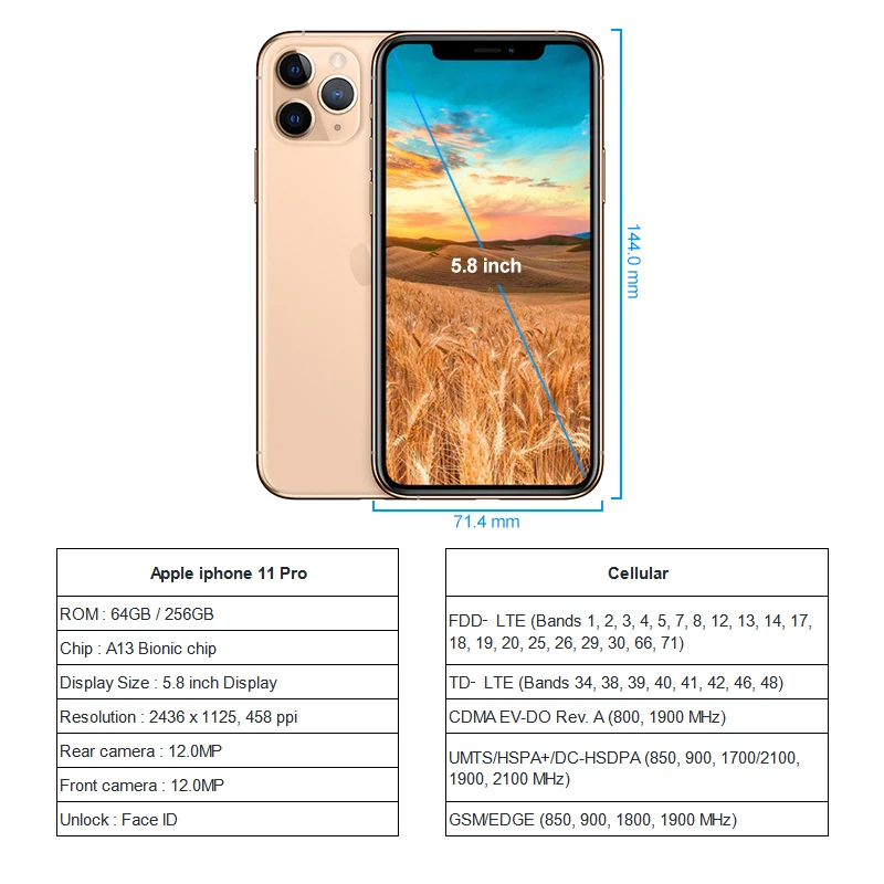 Apple iPhone 11 pro 64GB/256GB ROM Unlocked A13 Bionic Chip 5.8″ 2436 x 1125 Screen 12MP+12MP Camera With Face ID