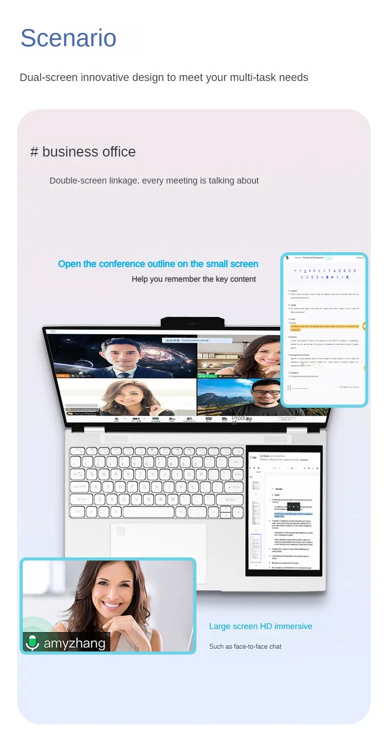 180 ° opening and closing, dual-screen design interactive handover; large round cap seven-color backlit keyboard, fingerprint unlock; plug-in 2 million HD camera |