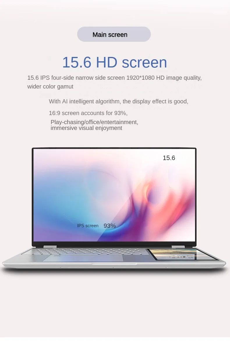 Main screen 15.6-inch IPS 1920 * 1080 four-sided narrow screen, screen ratio 93% . secondary screen 7-inch IPS screen + TP touch screen function, 1200 * 1920 resolution |
