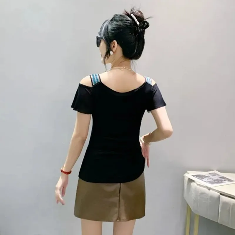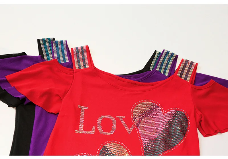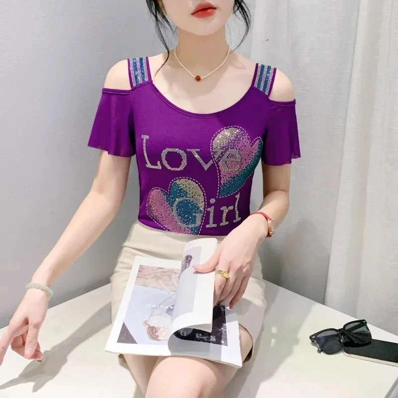 High-end Custom Summer New Shiny Love Heart Diamonds T-Shirts Sexy Off Shoulder Short Sleeve Tops Streetwear Girl Slim Mesh Tees