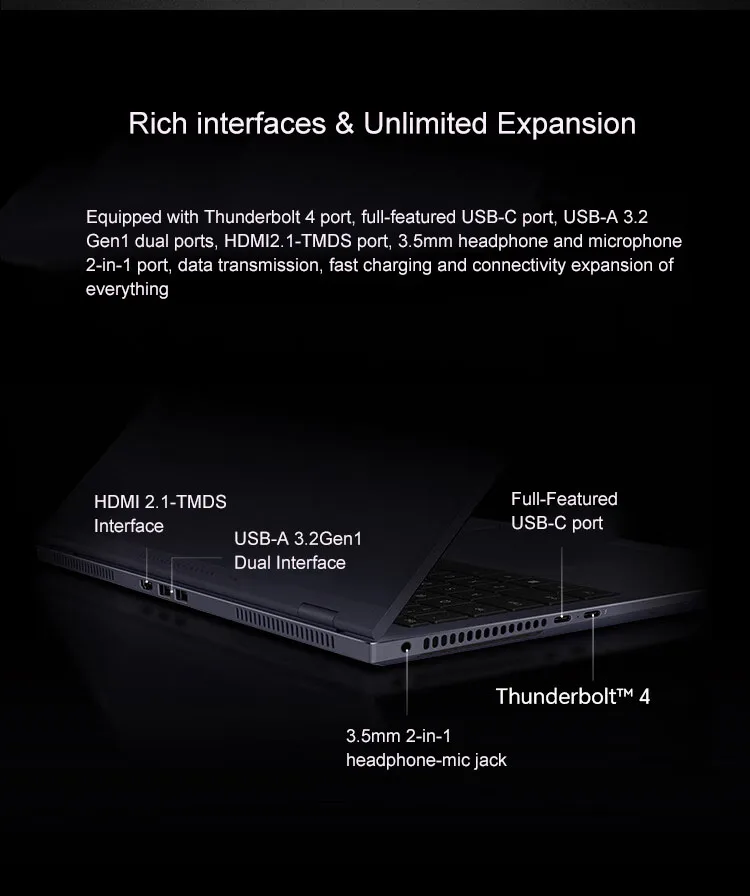 - Port: Thunderbolt 4,1×USB 3.2 Gen2,1×USB 3.2 Type C,3.5 mm Audio Jack,HDMI-compatible