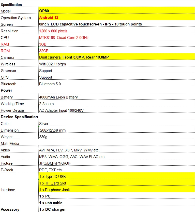 Hot Sales 8 INCH 3GB RAM 32GB ROM QP80 Android 12 Tablet PC MTK8168 CPU Quad Core Dual Camera 5MP WIFI Type-C USB Touch Film