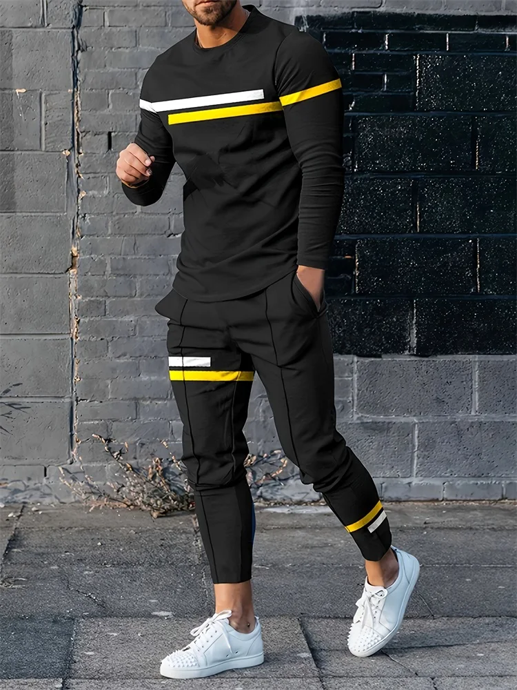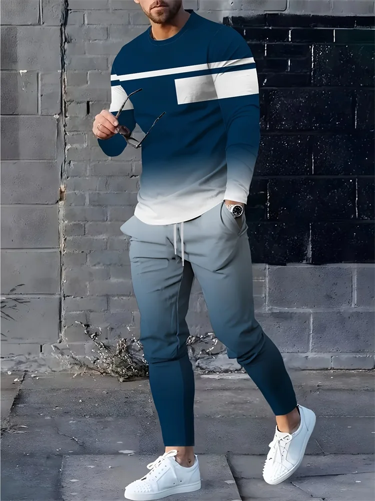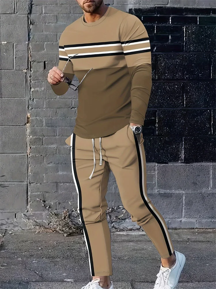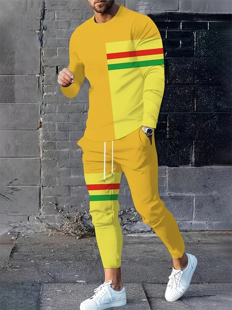 Spring And Fall Men’s Long Sleeve Pant Sets Red And Blue Striped Printed Men’s Set Everyday Fashion Men’s Long Sleeve T-shirt