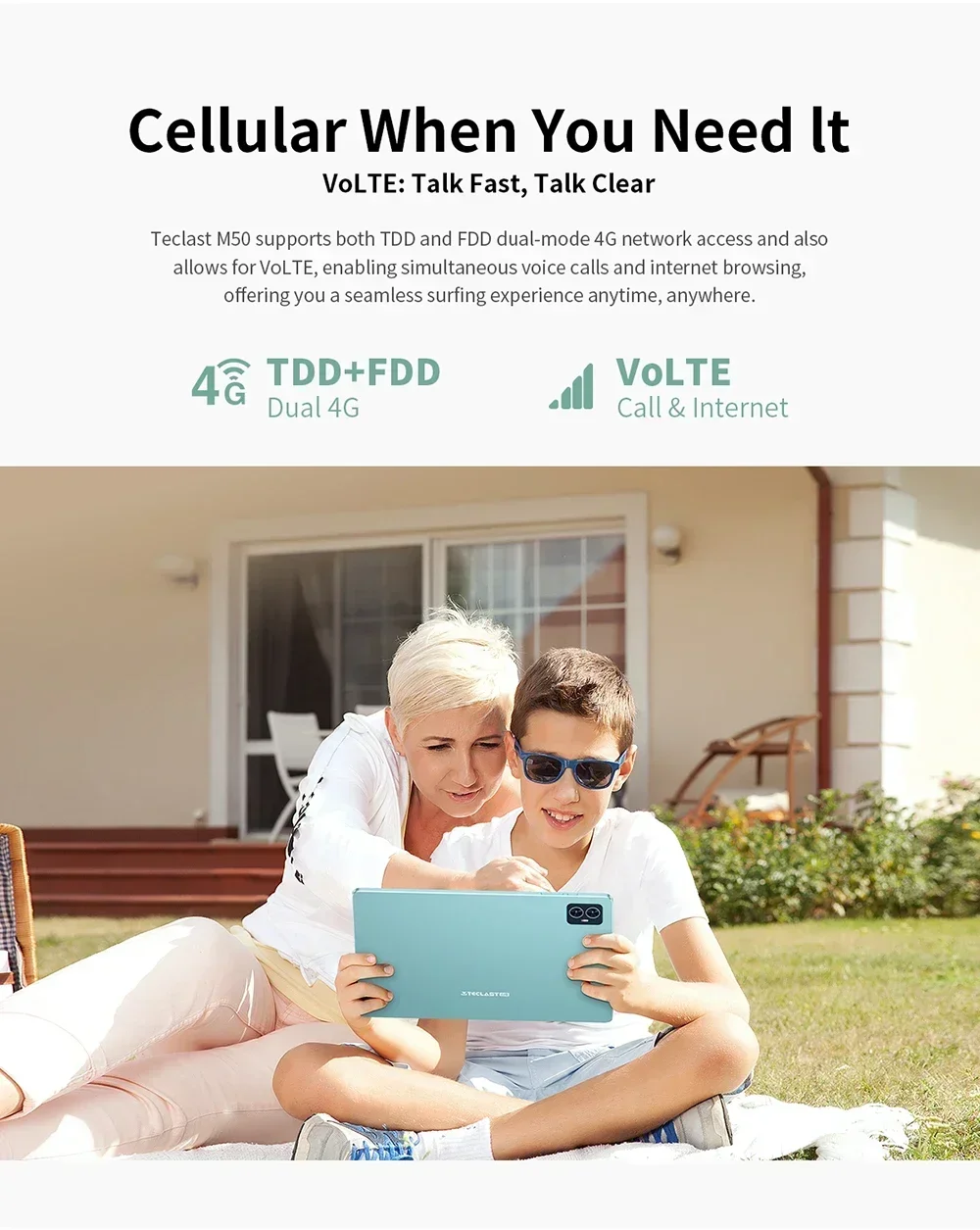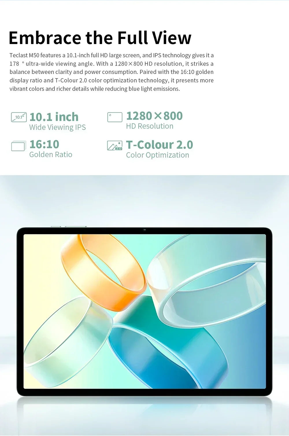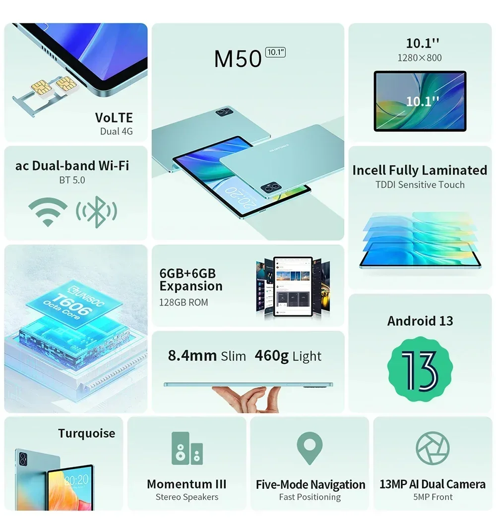 Teclast M50 Tablet Android 13 T606 6GB RAM 128GB ROM 10.1″ Tablets PC Incell Fully Laminated VoLTE Dual 4G 13MP AI Camera 450g