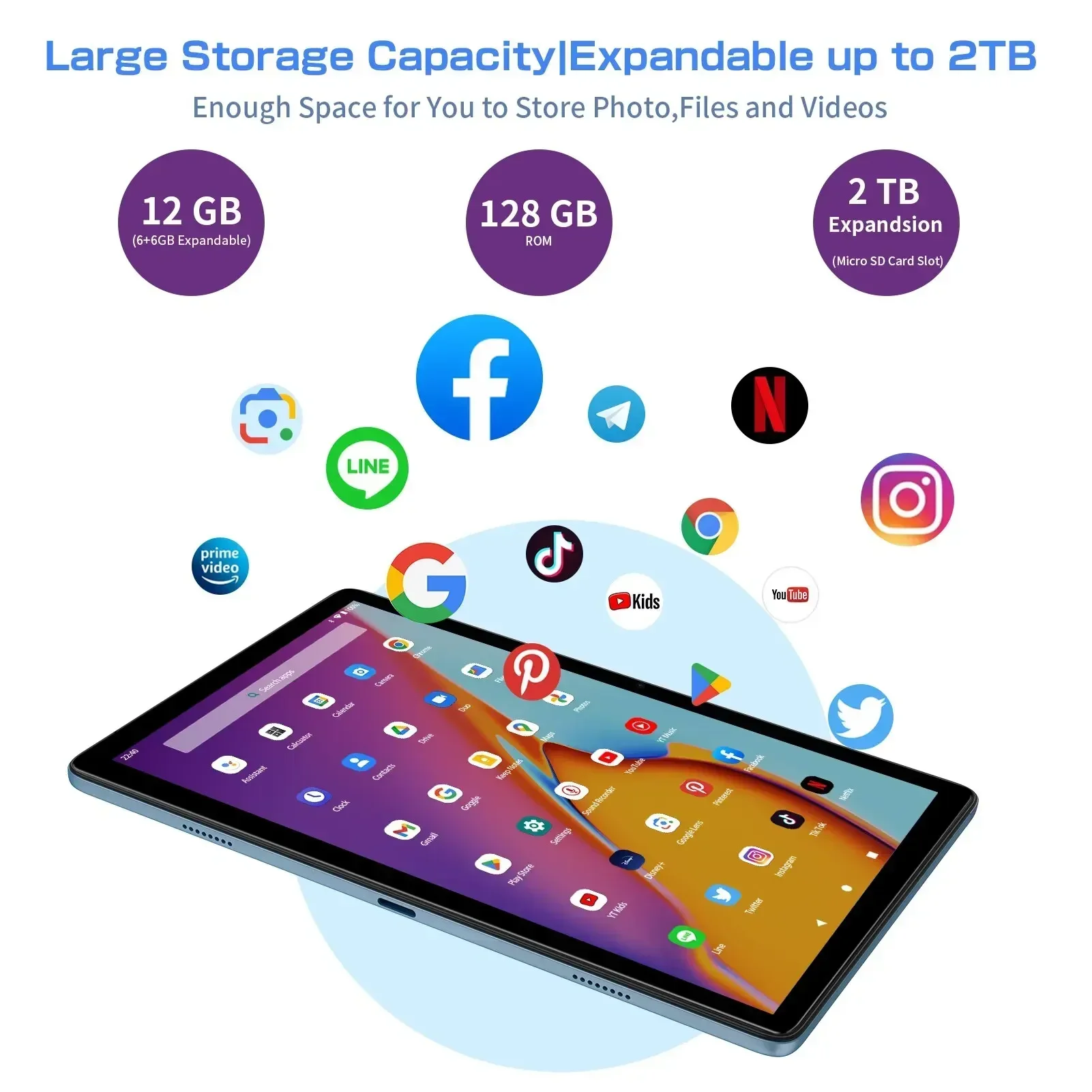 【The Latest Android 13 tablet】with Android 13 system, the Vasoun TAB12 tablet delivers lightning-fast performance and ample storage space for all your favorite apps, files, and media. Plus, it has 12GB(6+6 Expand) RAM +128GB ROM, supports up to 1TB of expandable memory, giving you even more room to store your photos, videos, and music.