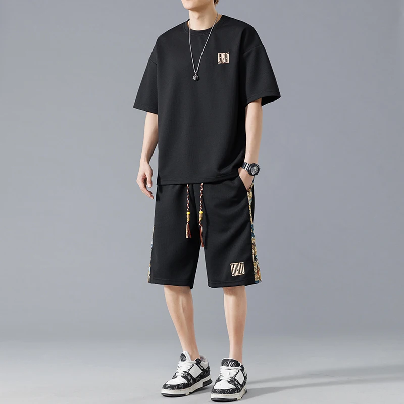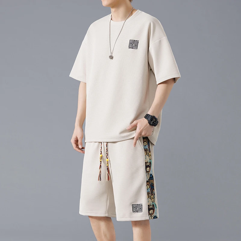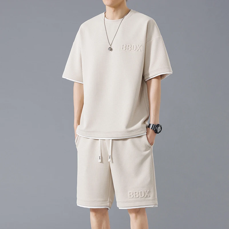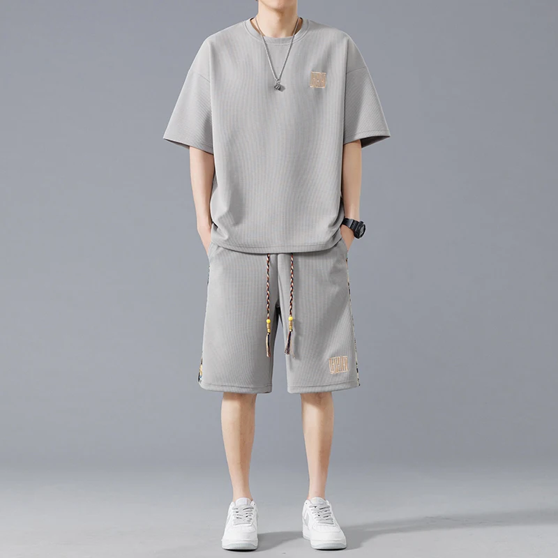 Waffle summer oversized casual short sleeved trendy set for men breathable and versatile handsome and loose fitting sports two