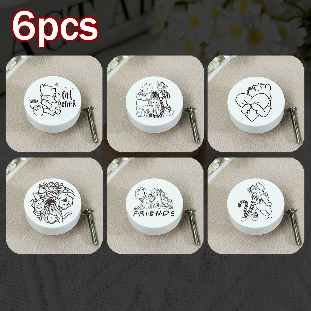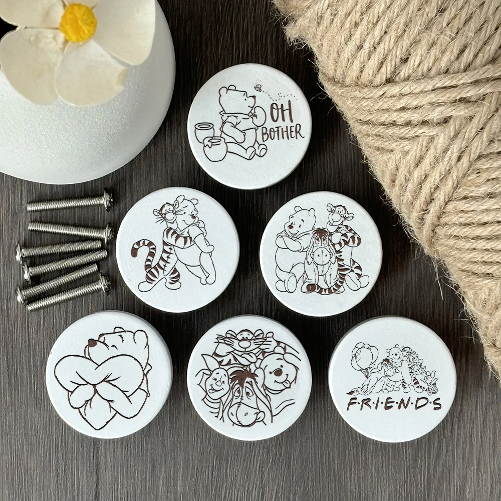6Pcs Drawer Knob Cute Winnie the Pooh Wooden Engraved Cabinet Pulls Kitchen Room Nursery Dresser Knobs Children Furniture Handle