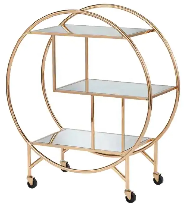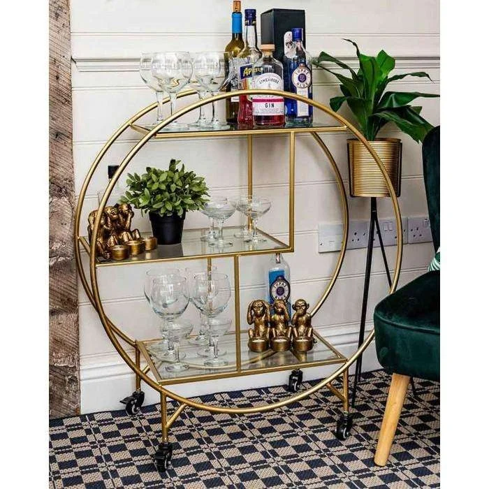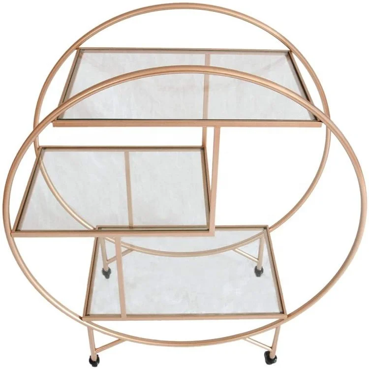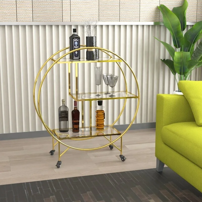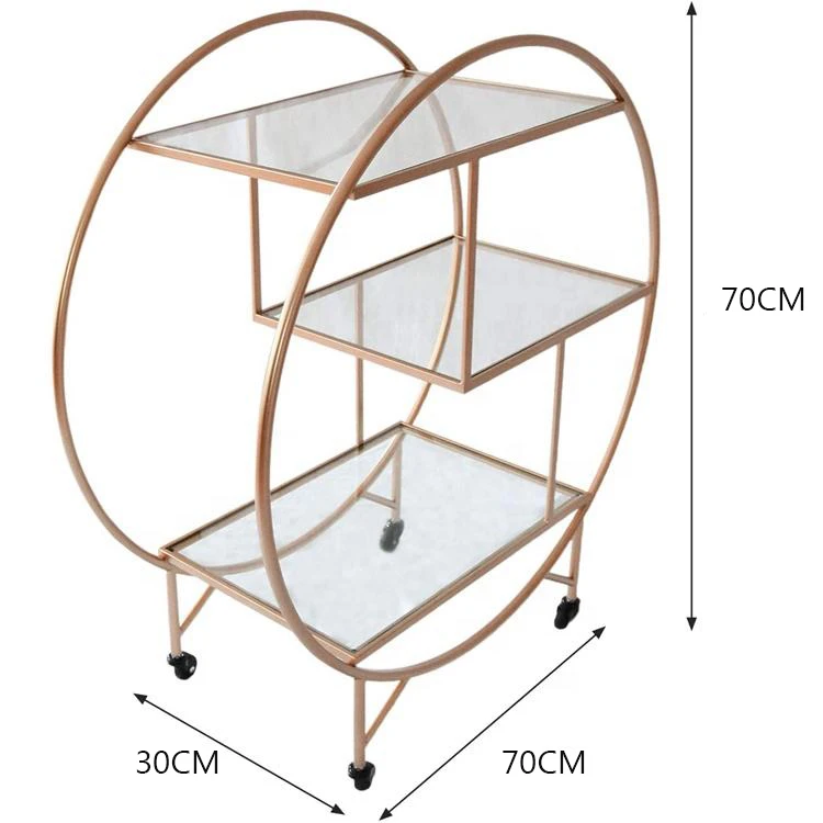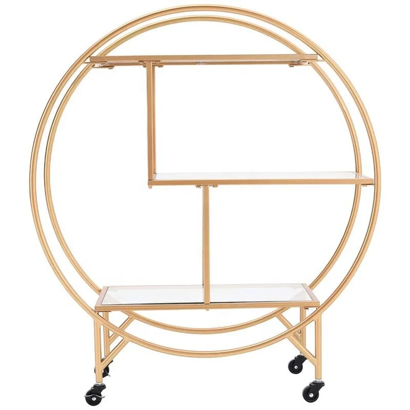 Light Luxury Round Frame With 4 Wheel 3 Tier Gold Metal With Mirror Trolley Bar Cart Hotel Furniture Cart Home Garden Storage
