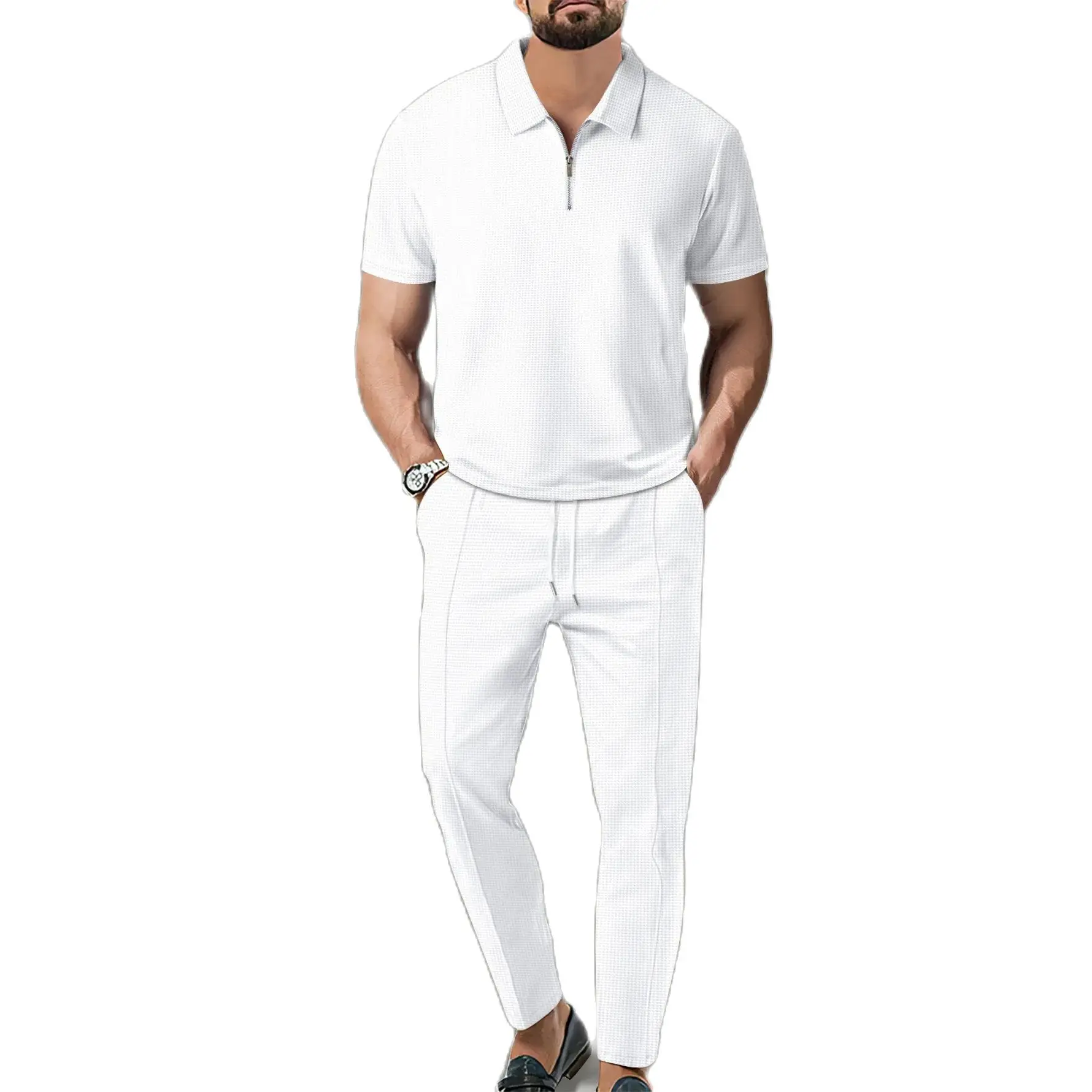2024 New Trend Men’s Sport Suit Autumn New Mens Suits Solid Color Waffle Lapel Short Sleeve Zipper Pants Set for Men