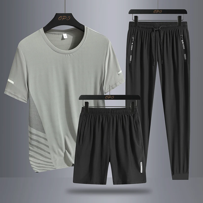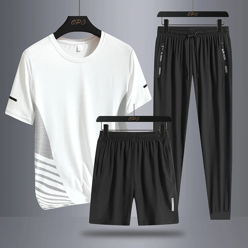 Summer men’s sports running three piece set with round neck, short sleeved T-shirt, shorts, long pants, loose ice silk set
