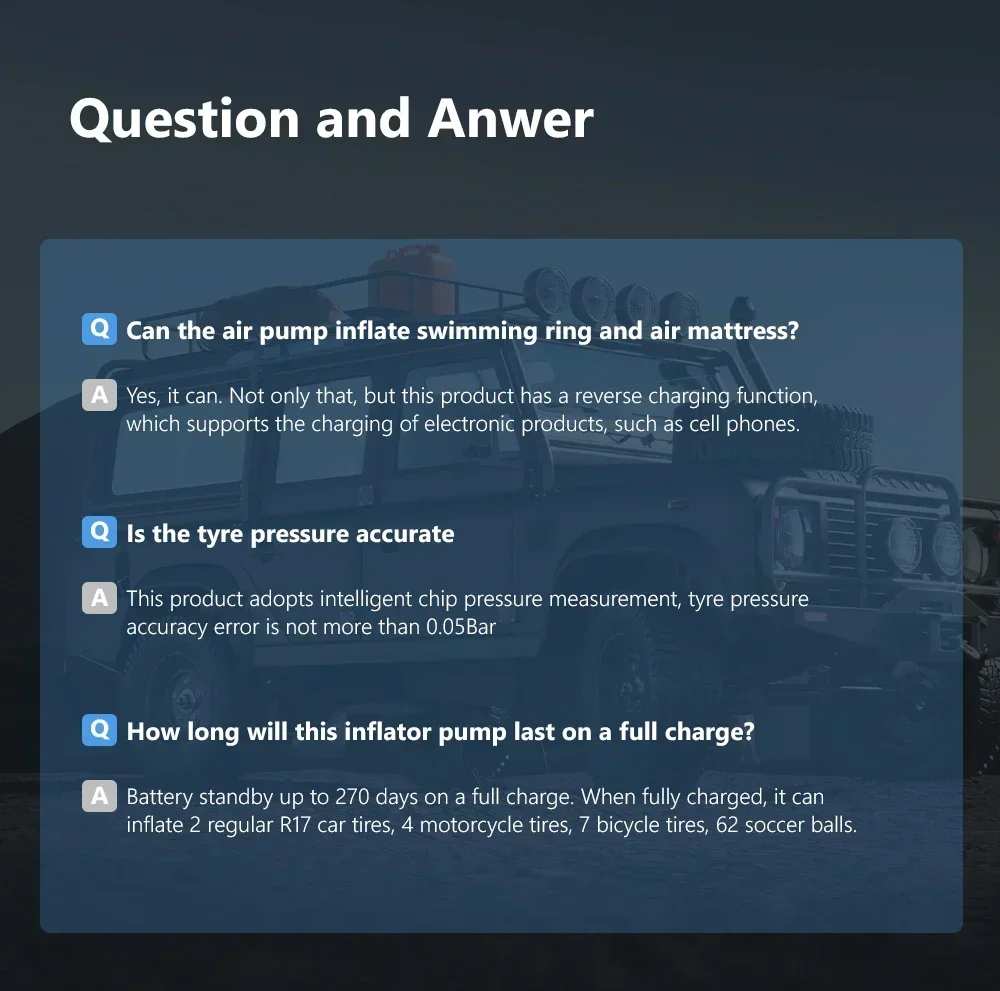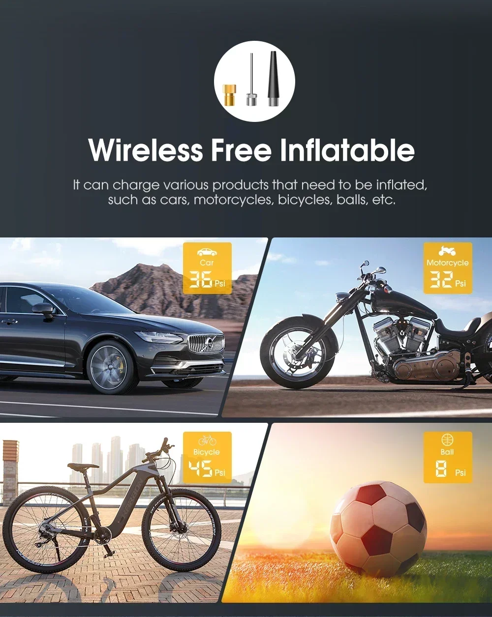 It can charge a variety of products that need to be inflated, such as cars, motorcycles, bicycles, balls and so on.