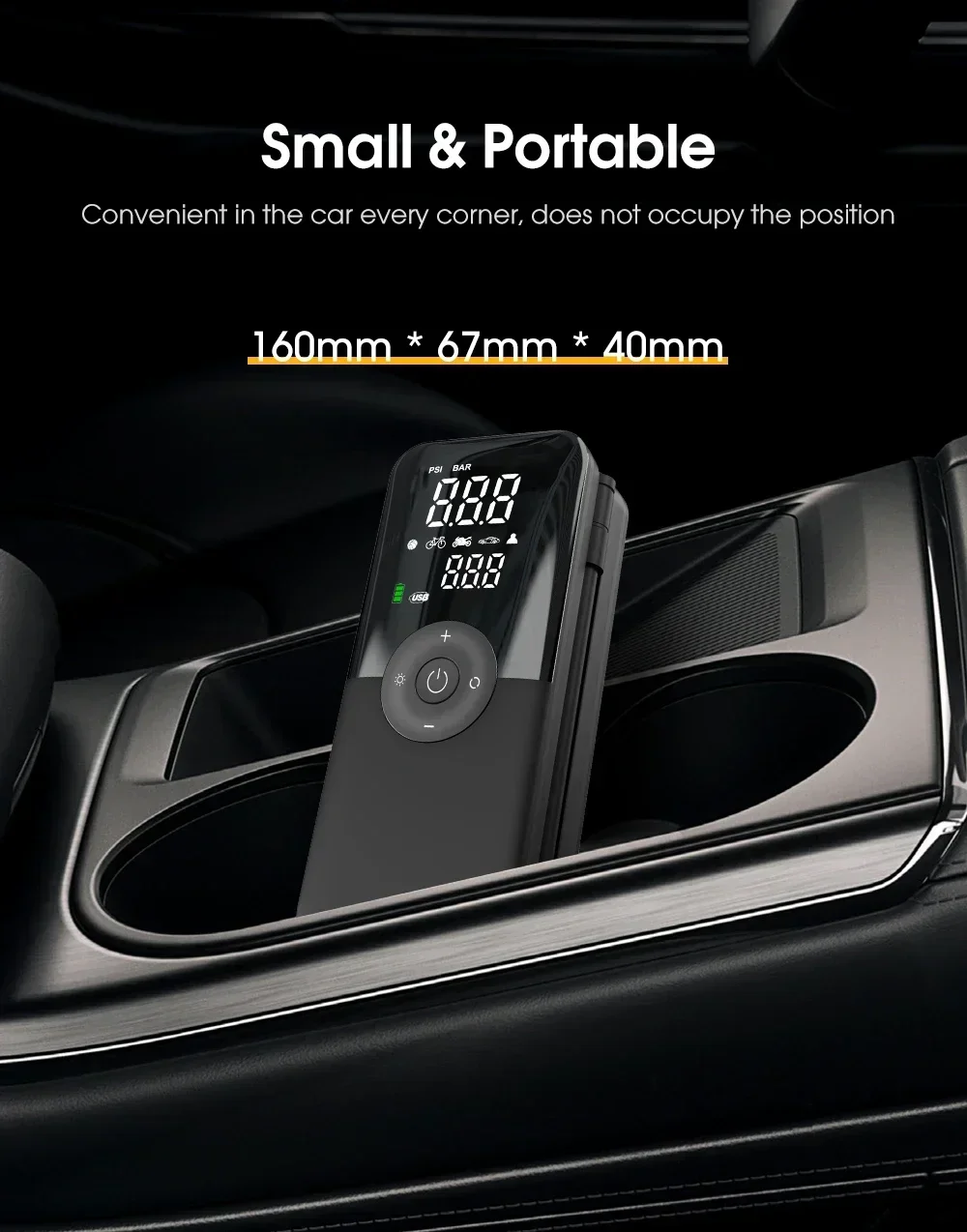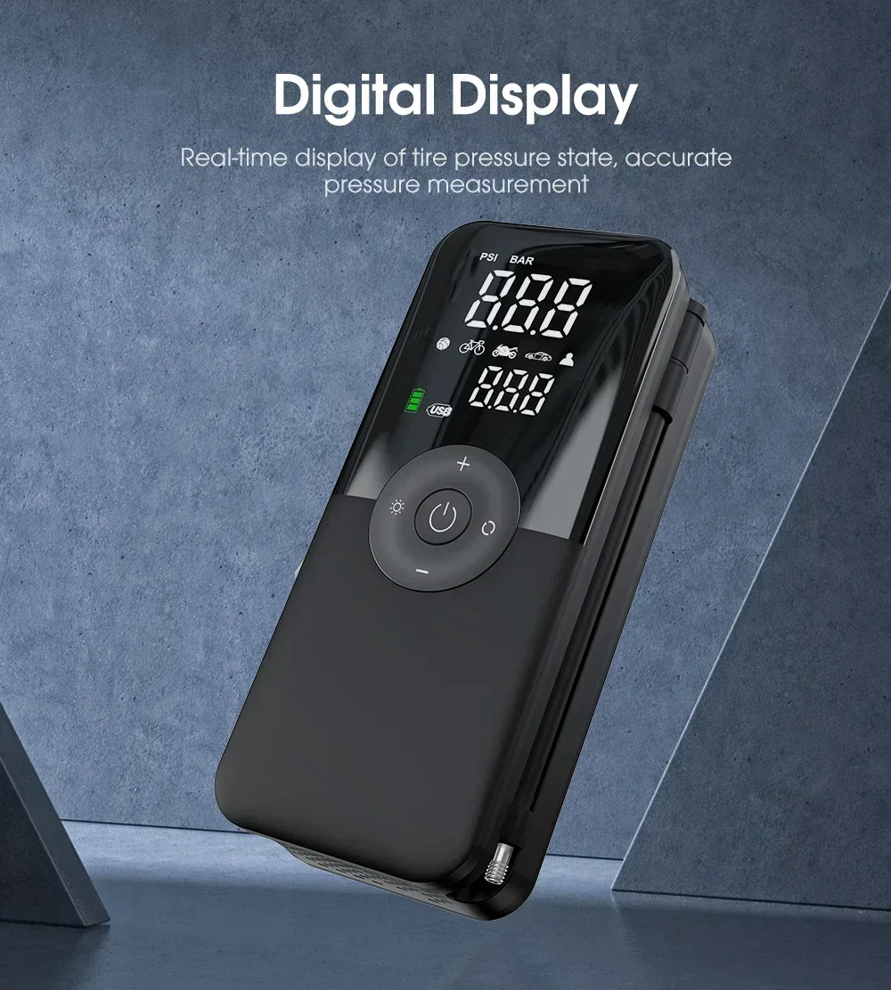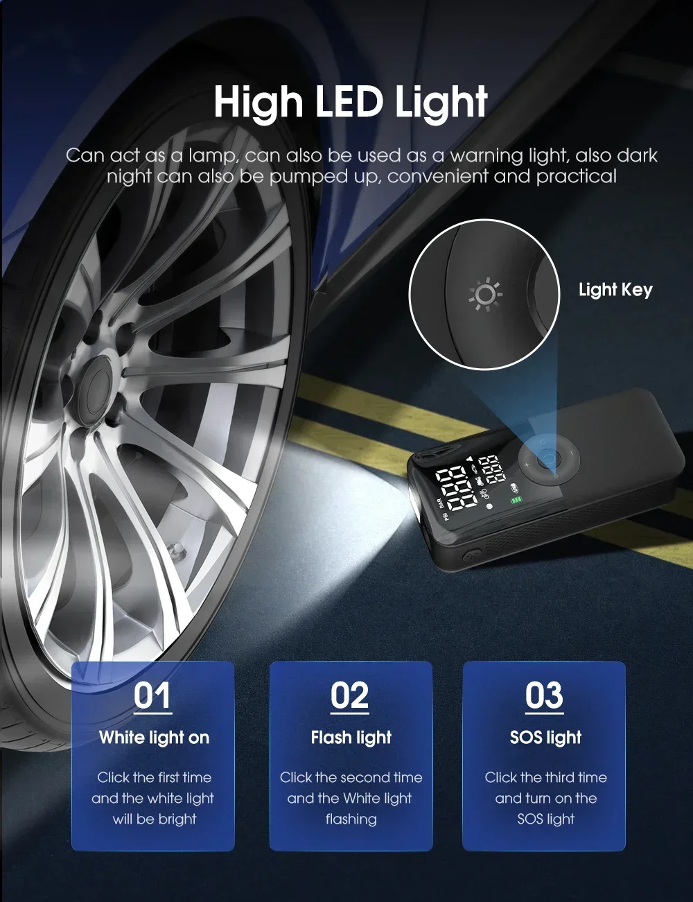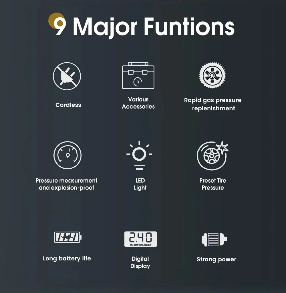 Cordless / Various Rapid gas pressure /Accessories replenishment / Pressure measurement and explosion-proof / LED Light / Preset Tire Pressure / Long battery life / Digital Display / strong power