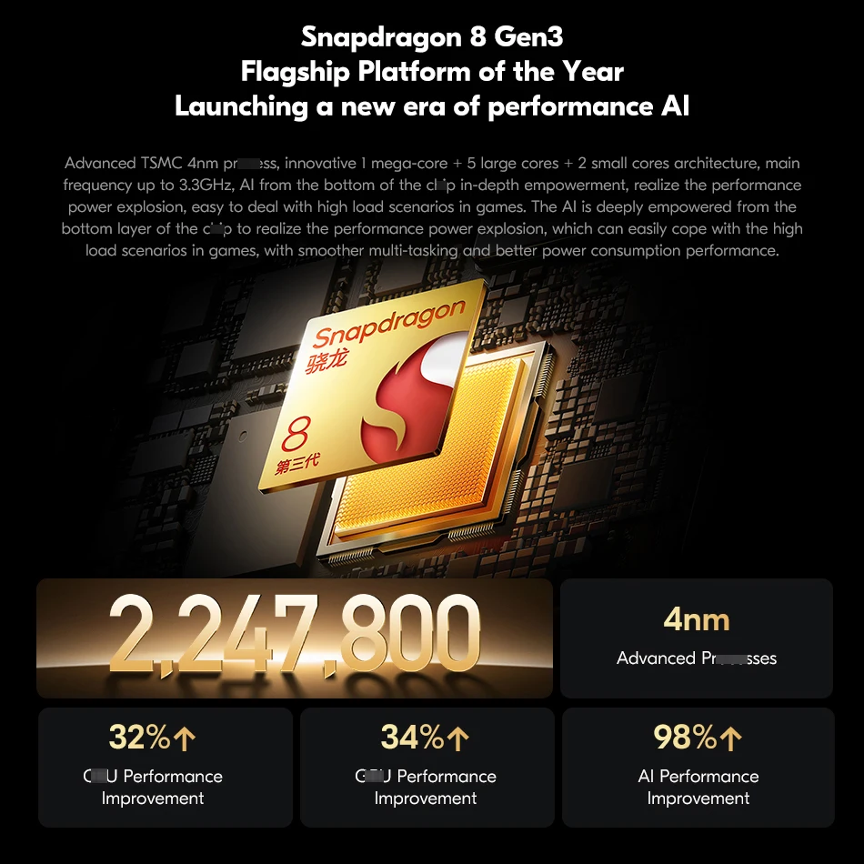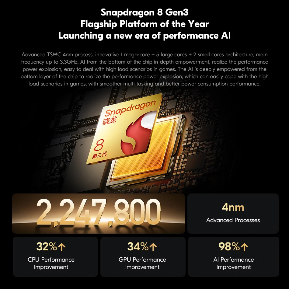 > Redmi K70 Pro —————Qualcomm Snapdragon 8 Gen 3 Octa Core, 4nm, up to 3.3 GHz, Adreno