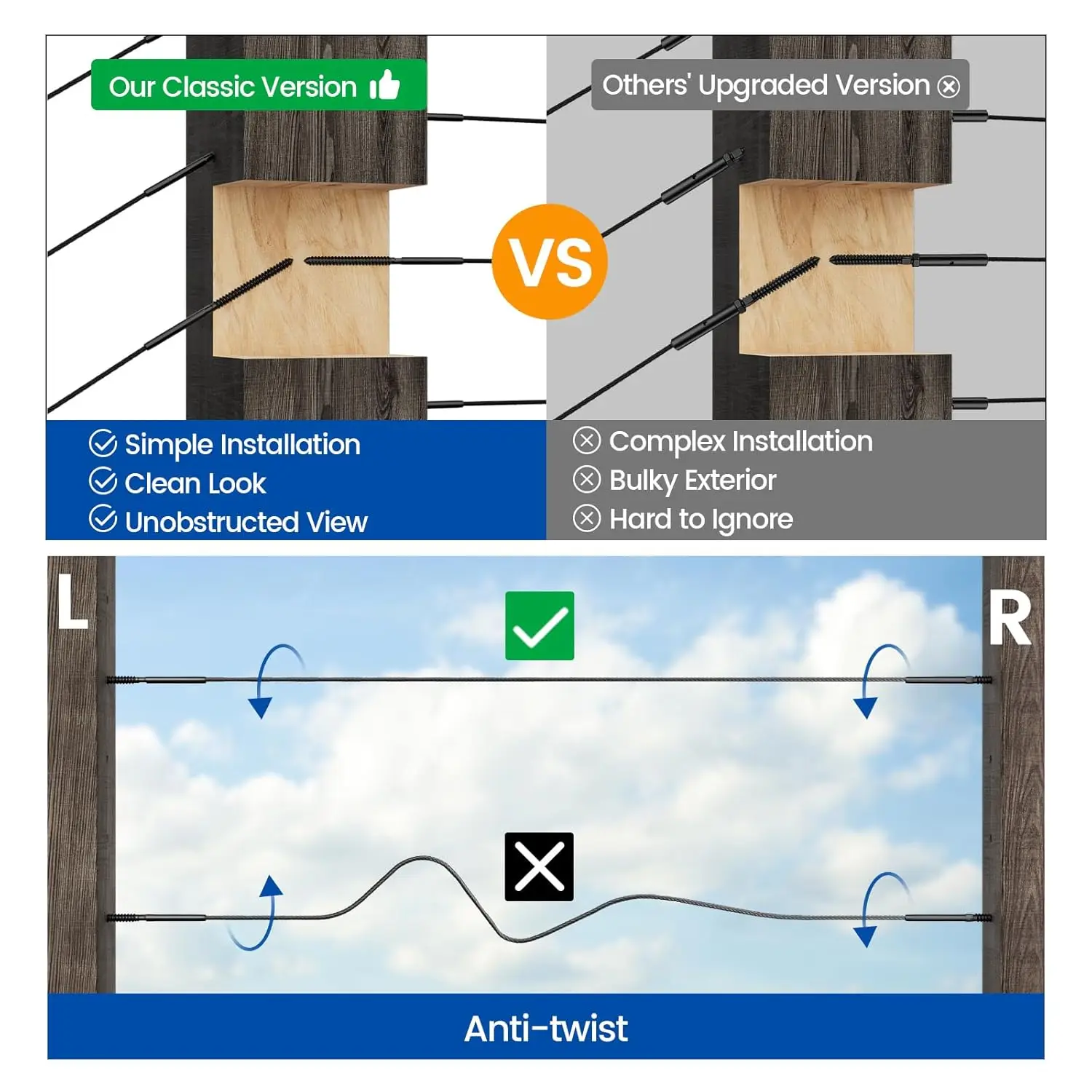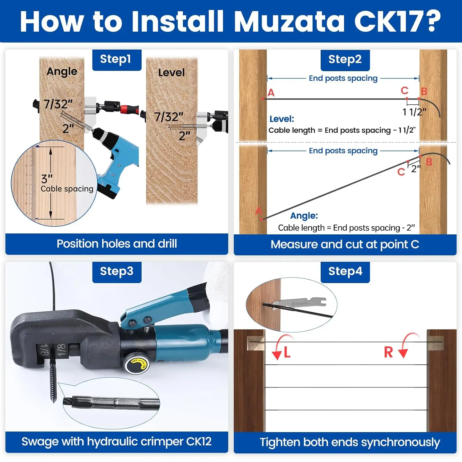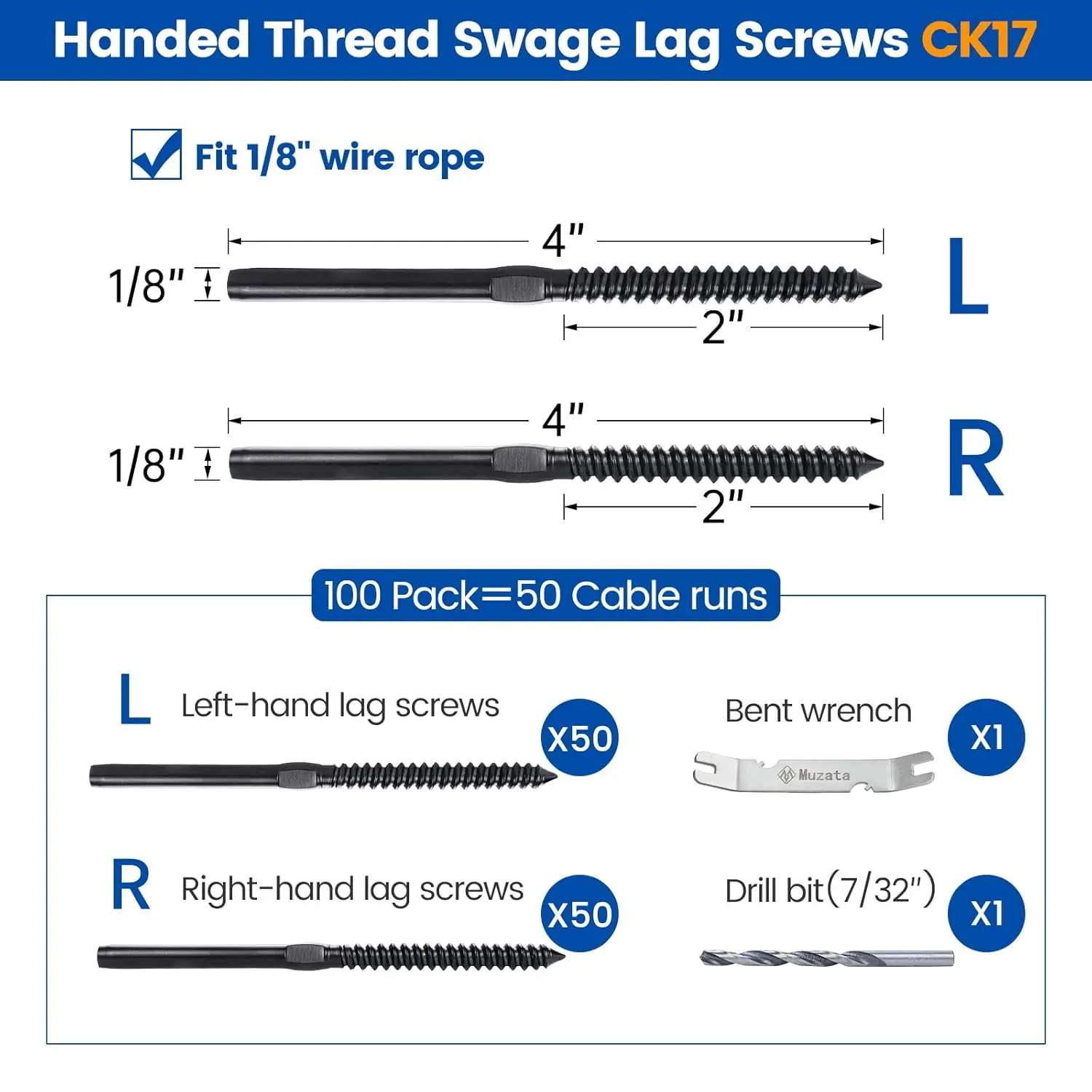 - Left&Right Feature – Package comes with 50 left and 50 right black hand lag screws for 50 cable runs, 1 drill bit, and 1 bent wrench. This cable railing kit is designed to rotate wire rope in the same direction to avoid twisting or damaging the wire rope. Professional hydraulic crimper Muzata CR09 is recommended