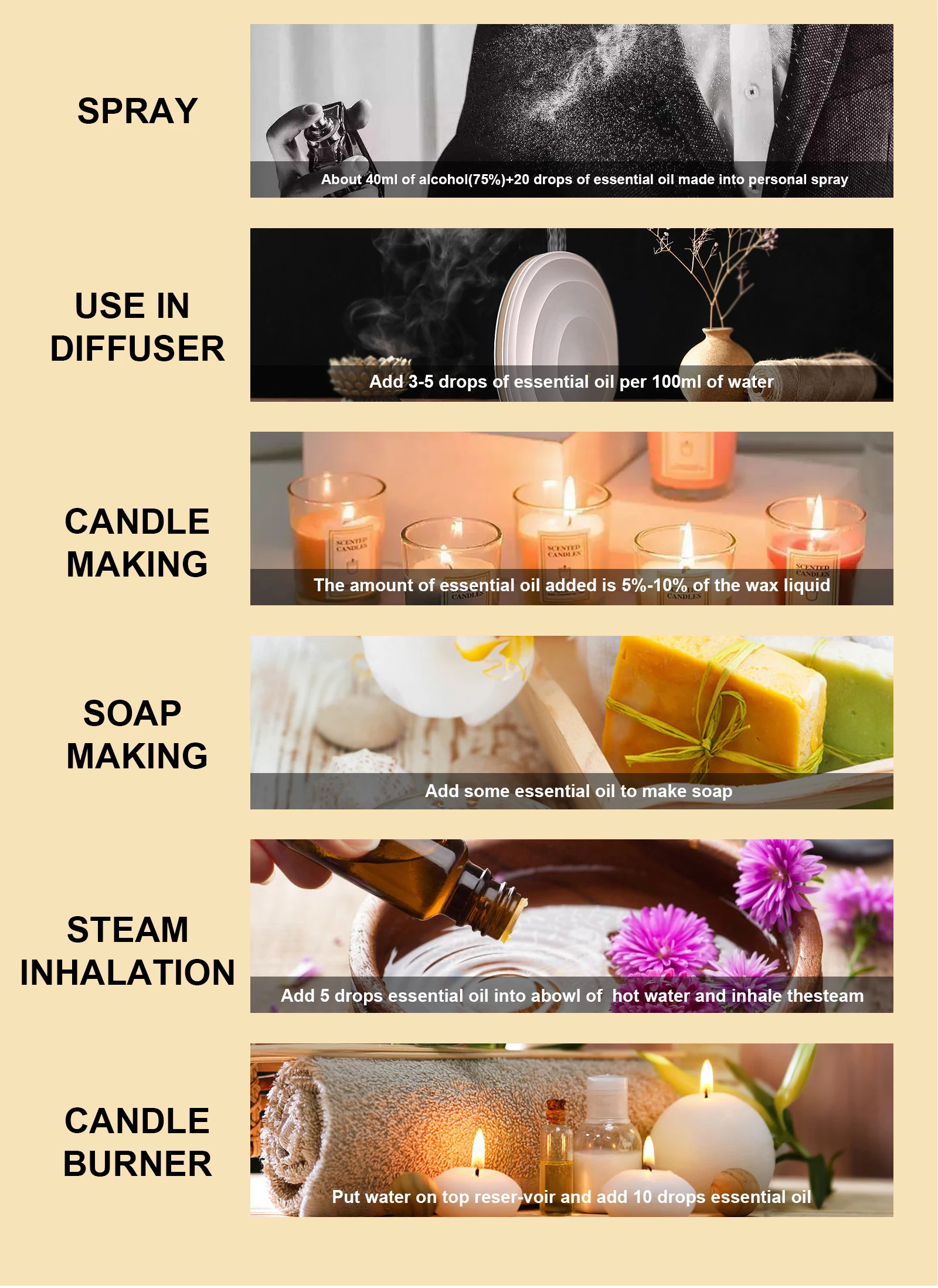 1,Oil for Diffuser – One of the most popular ways is using them with an oil diffuser. Adding a few drops to your oil burner/diffuser will create a lasting beautiful aroma, you can also mix oils to create your own smell.