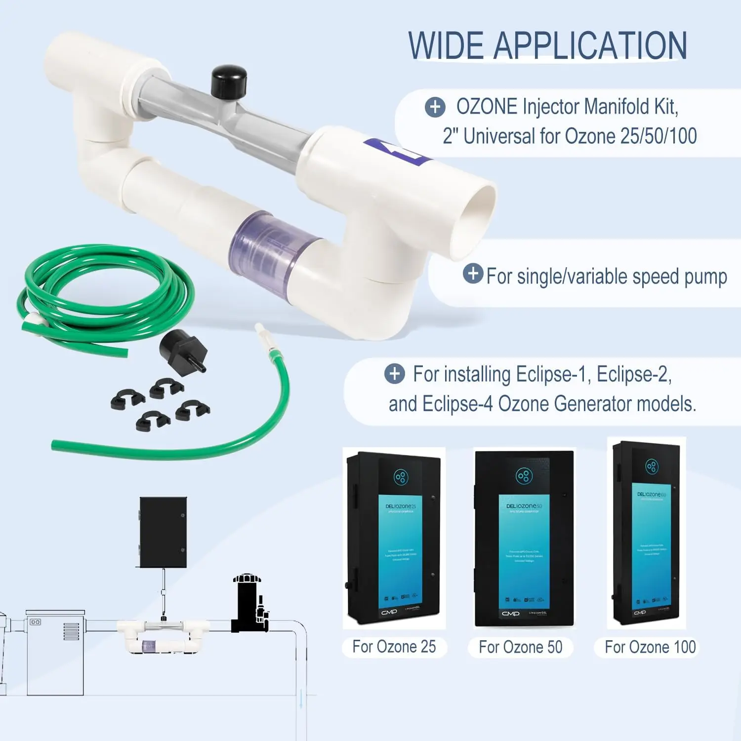 【Perfect Compatibility】Complete Next Generation Installation Kit for installing Ozone Generators for pools. This 9-0210-11 Injector Manifold Installation Kit is compatible with Eclipse EC-10, EC-20, EC-40 Pool Ozone Generator. For use with Ozone 25, 50, and 100 Systems. Fit 25,000 Gallons/50,000 Gallons/100,000 Gallons System.