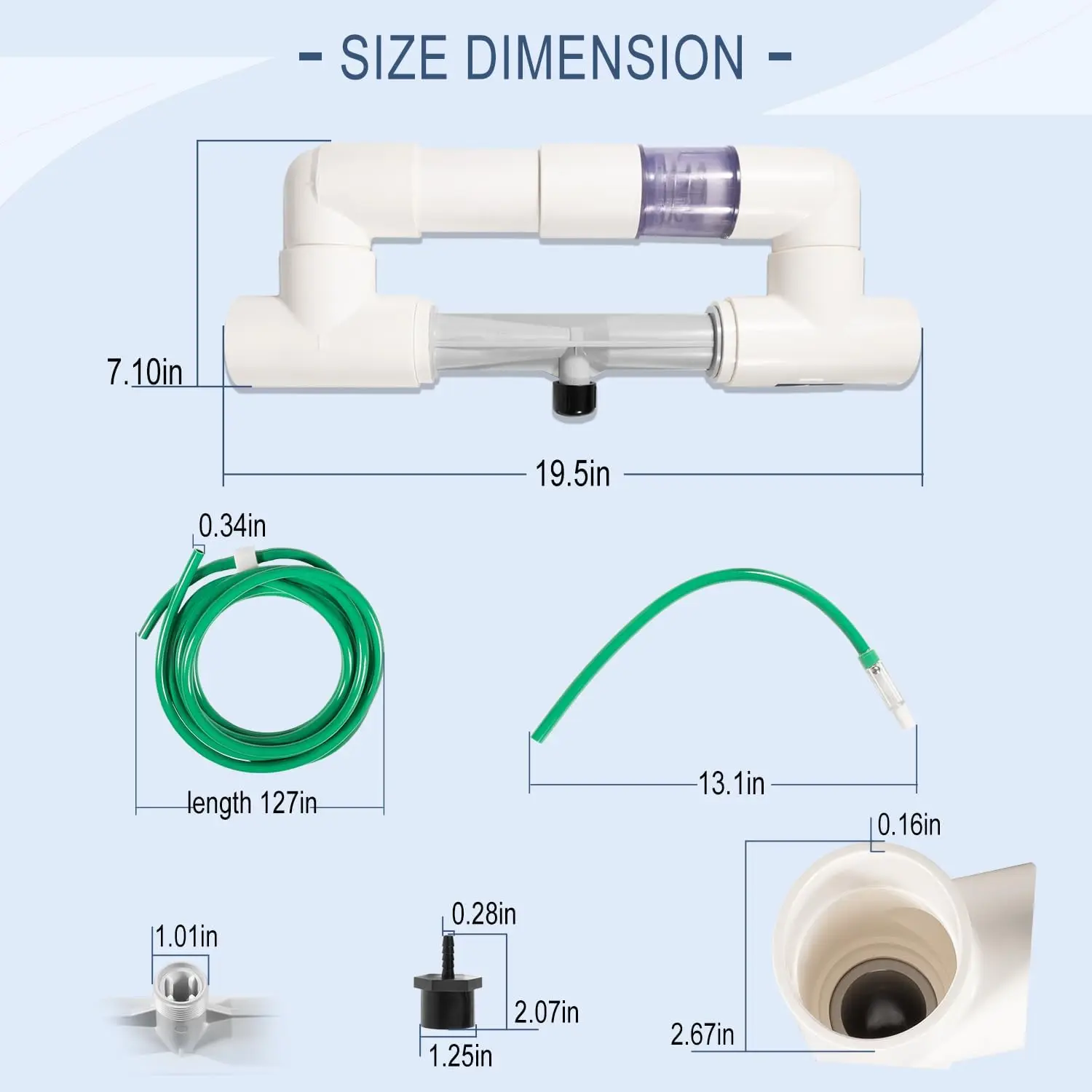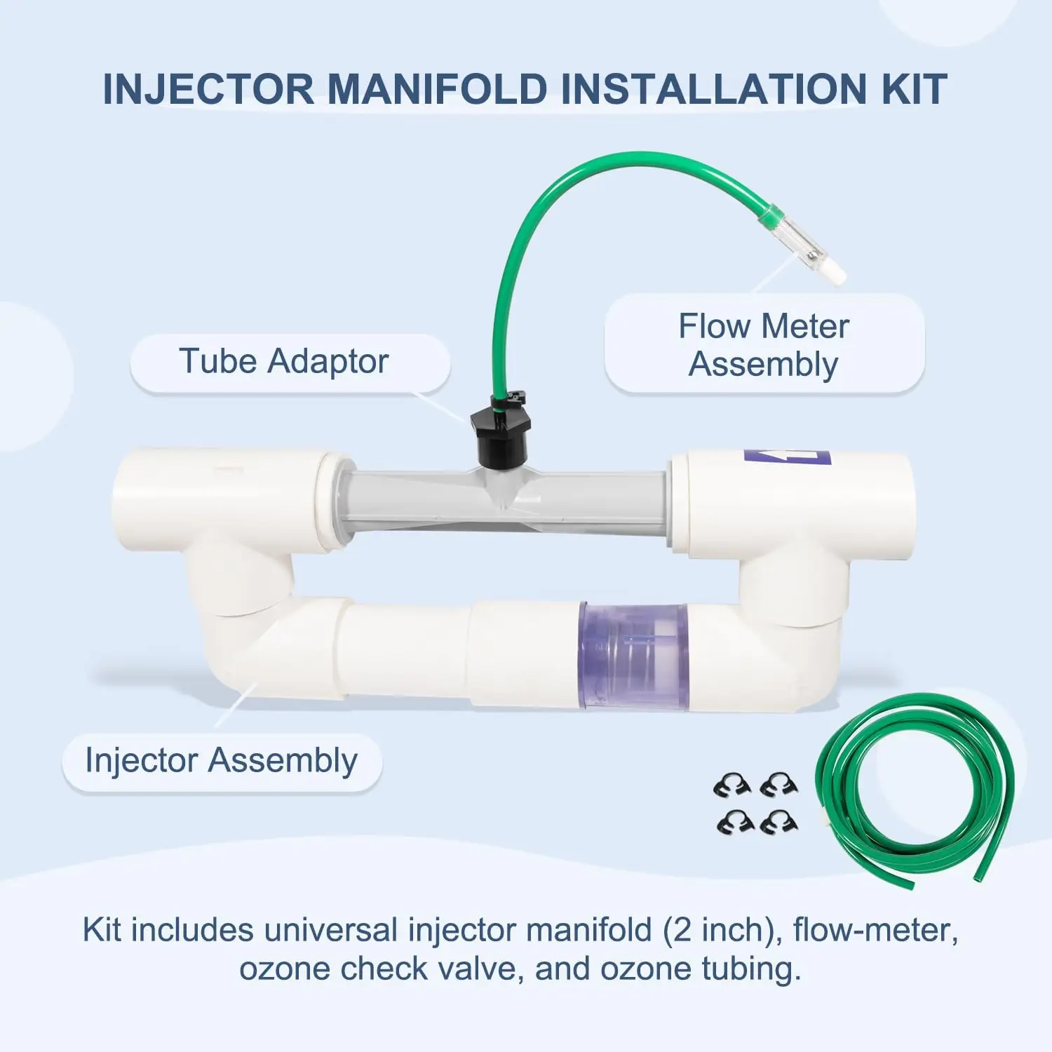 【2" Universal Injector Manifold Kit】This is a complete 9-0210-11 Installation Kit, designed to compatible with Eclipse Series Ozone Systems. The kit includes all the components and hardware necessary for a successful installation, including a 2" pressure side injector manifold, injector hose fitting adapter, 10 feet of ozone tubing, check valve assembly and a flow meter.