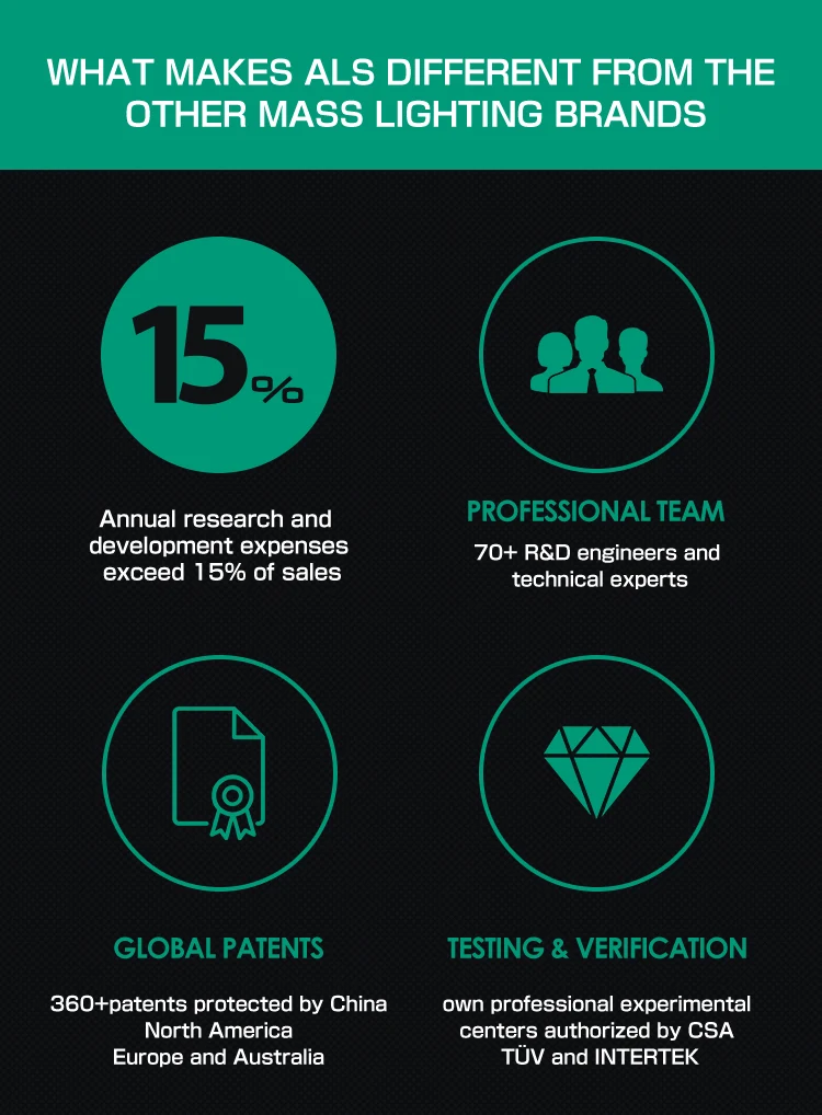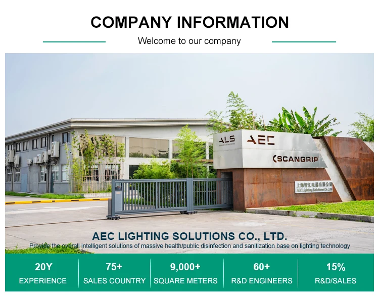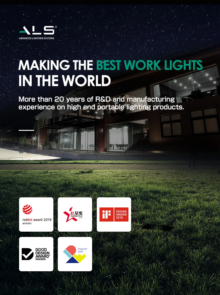 AEC Lighting Solutions Co., LTD was established in 20 00 and has more than 20 years’ comprehensive business experience primarily with focus on the North American and European portable lighting market. AEC is one of China’s professional intelligent lighting solutions provider. AEC talent designs have received Red Dot, IF, IDEA and Red Star awards for their combination of quality, performance and style. The ALS range is new, but it’s built on very extensive experience and an unwavering dedication. Created by AEC in close collaboration with international partner, the ALS range combines the excellence of two worlds: cutting-edge Chinese production know-how and North American/European business insight. ALS is set to make a real impact on the world of work lights. In 20 20, AEC launched a new series-UV series. UV series combined strong research and development capacity and advanced technologies such as UVC and Ozone based on the concept of massive health in public places, and tested by SGS, aiming at consumers from different dimensions of sterilization, to bring safe, efficient and professional sterilization solutions and services to the world. AEC keep a close eye on all new developments. When opportunities arise, we act fast, creating new products to ensure that you always get the best the market can offer.