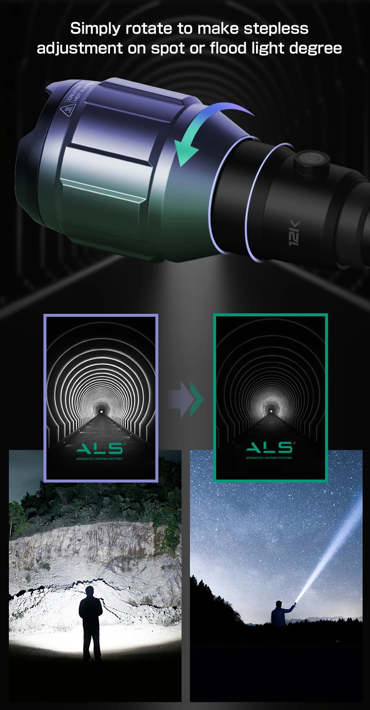 Simply rotate to make stepless adjustment on spot or flood light degree