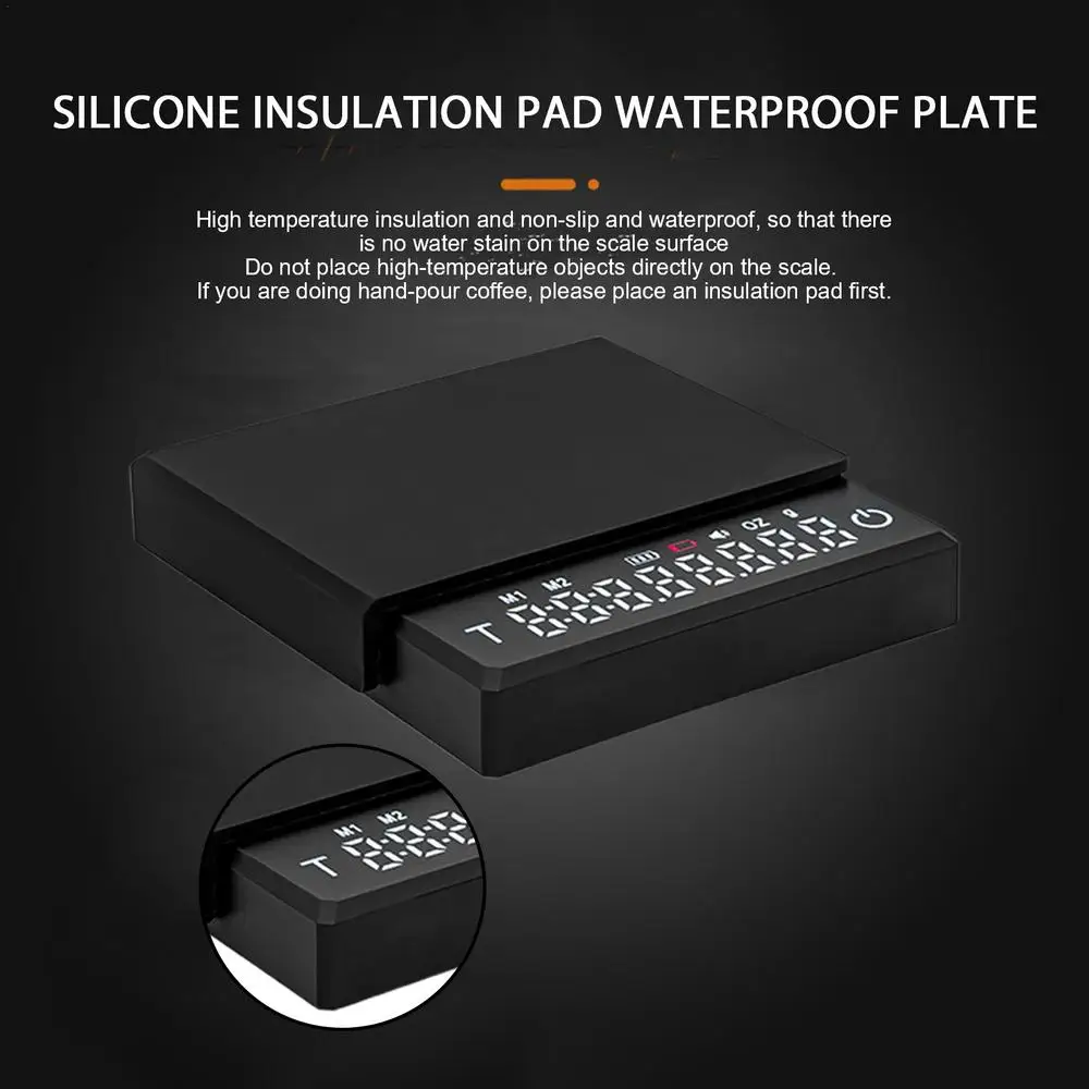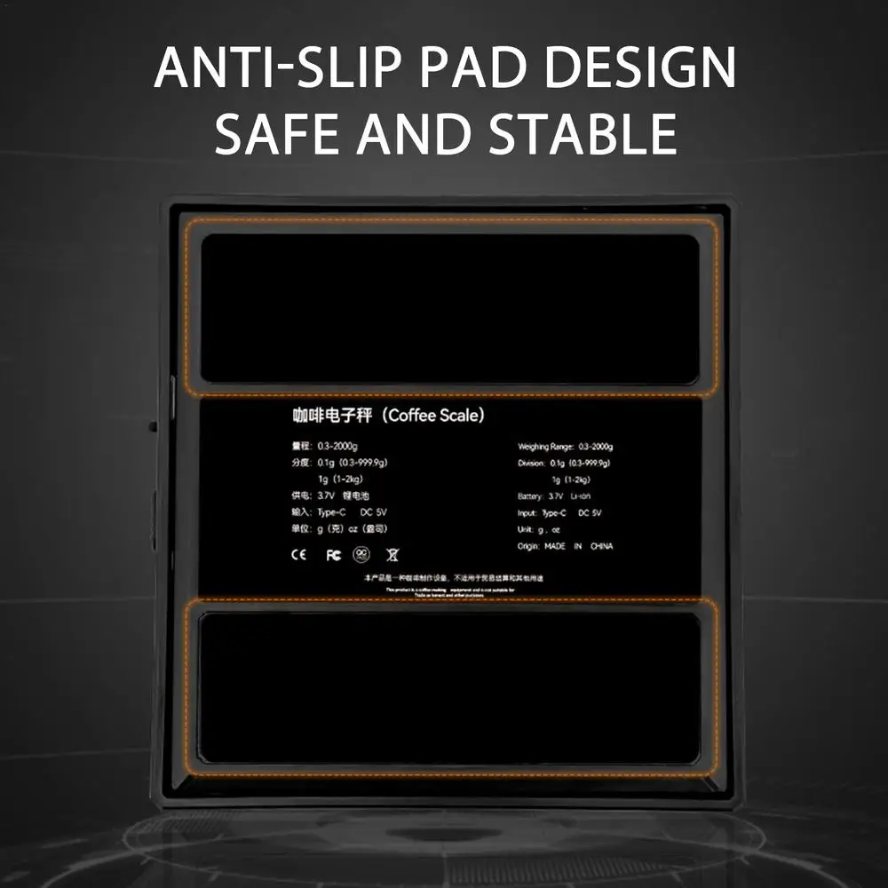 5.Non-Slip: Engineered for resilience, our coffee scale’s non-slip design safeguards against the wear of frequent use and exposure to moisture, ensuring a safer experience and prolonged lifespan.