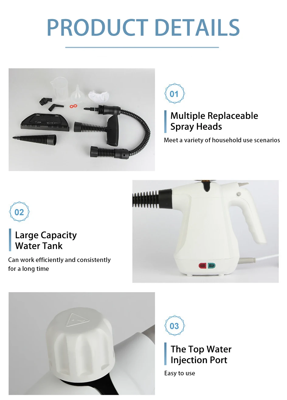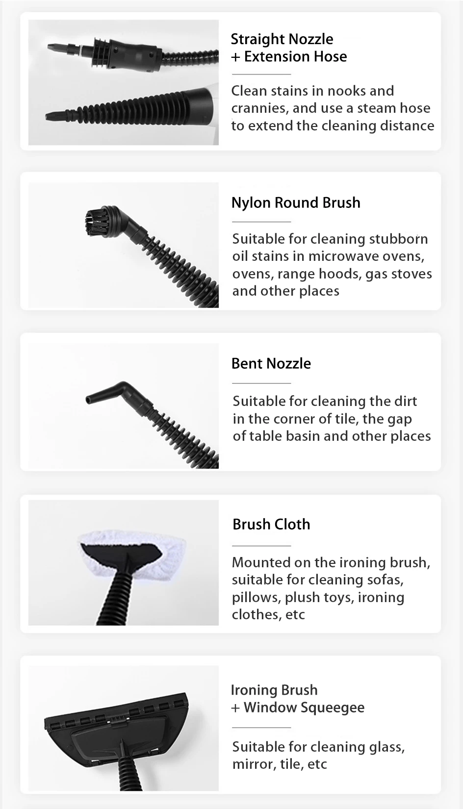 【High Temperature and Pressurized】With 1000W high power to generate 100℃-150℃ high temperature,the pressure steam up to 3.0bar, effectively remove stubborn greasy dirt and harmful substances.