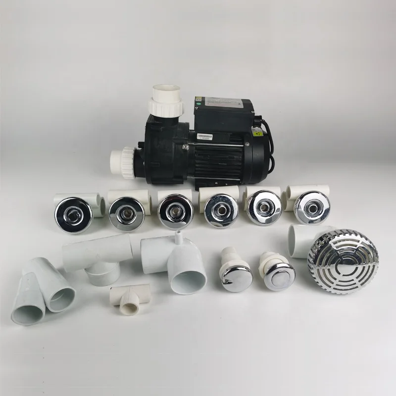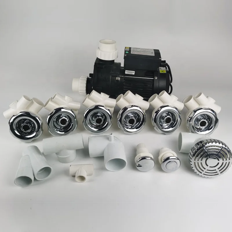 Description of One Set | Whirlpool System 1pc 1.5HP(1.1KW) hydro pump 6pcs D68mm jets 1pc air control 1pc push button 1pc suction 2pcs big plug 2pcs small plug 1pc 90degree elbow 2pcs Y shape joint 1pc pump tee fitting 1pc tee connection hose to jets and suction |
