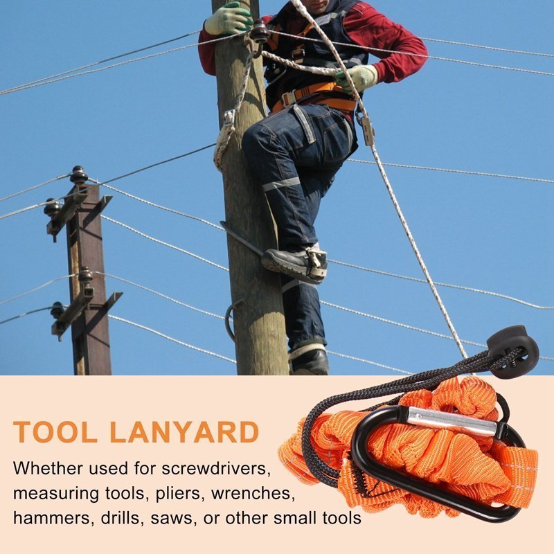 [FALL PROTECTION TOOL] This tool lanyard is designed for limiting the dynamic force on body and equipment caused by dropped tools, preventing from injury and damage.Anodized quick-release single-action Aluminum Self-locking Carabiner for connecting belt on harness. Double-hole cord stopper at the other end for sealing and locking tool helve.