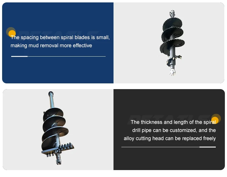 The spiral drill can replace the original drilling equipment in power pole drilling construction, tree planting, pit drilling, building pile driving drilling, and photovoltaic power generation drilling. Moreover, this equipment can achieve high efficiency, flexibility, safety, low cost, and multiple uses per machine. Using an excavator as a carrier, it can drill holes at any position within the diameter of the digging arm without moving the entire machine. It can drill vertically, at any angle, or horizontally, truly achieving efficient drilling and greatly reducing non drilling time.