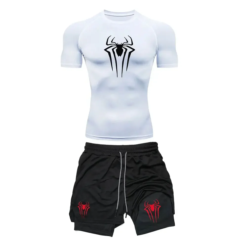 Men’s Workout Compression Set Y2K Spider Printed Gym Tshirts Breathable Running Shorts Quick Dry Sports Rash Guard Sportwear Set