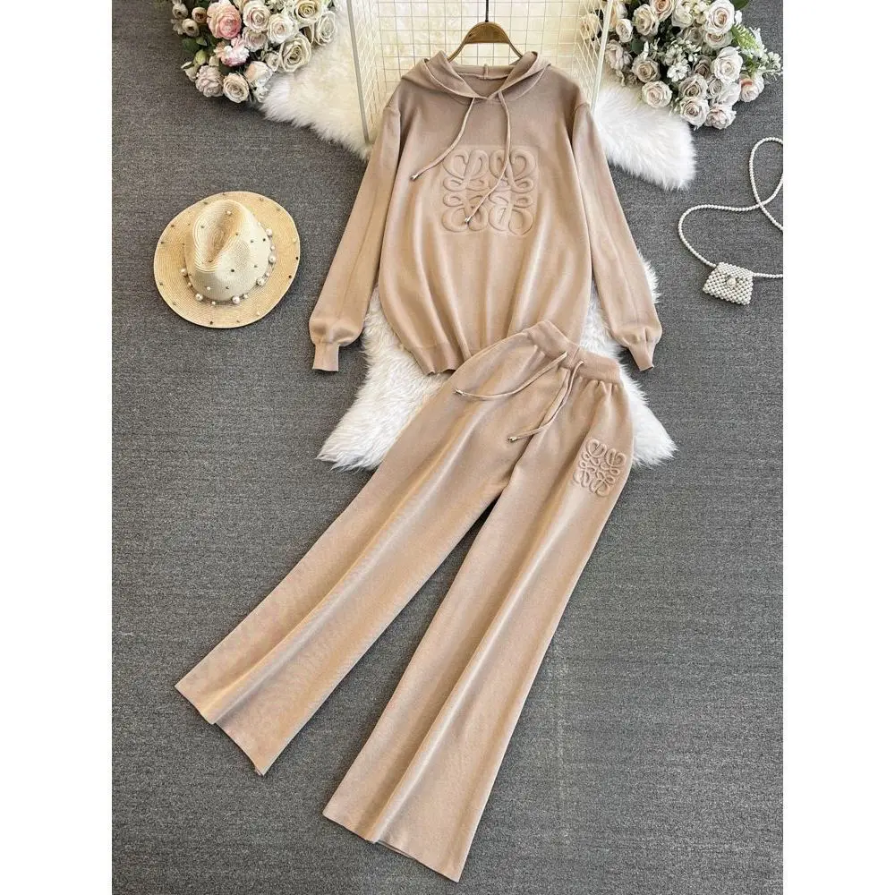 Fashion Suit Women’s Korean Version Loose Knit Hooded Top Casual High Waist Slimming Straight Leg Wide Leg Pants Two-piece Set