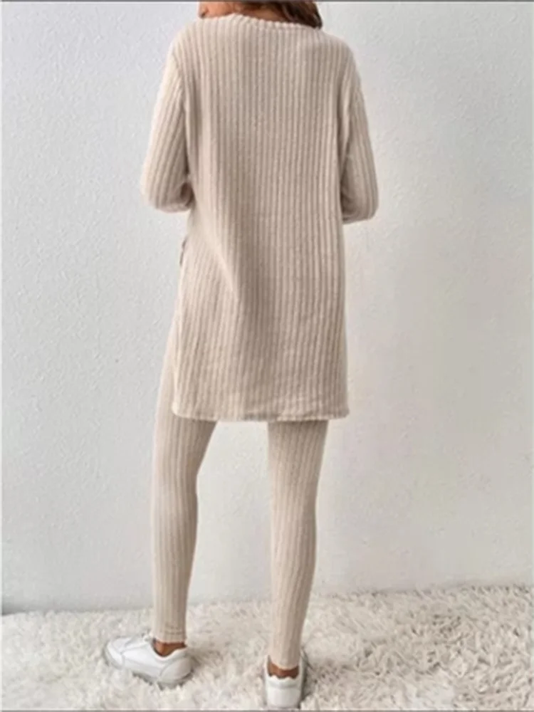 Women’s Casual Ribbed Pants Set, Long Sleeved, Slim Fit, Monochromatic, Slit, Autumn, Winter Clothes